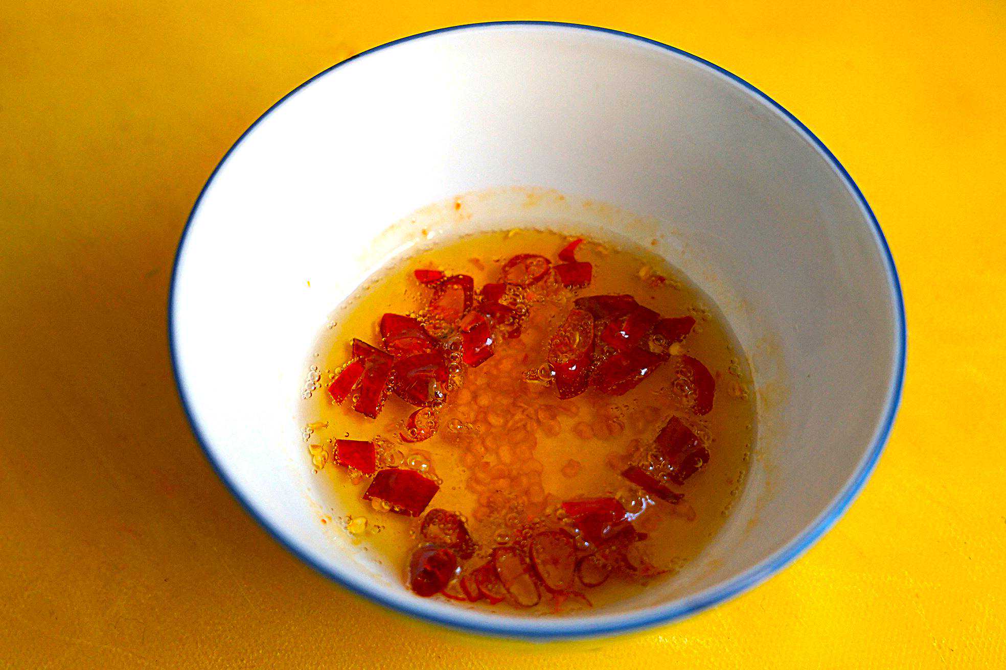 3、将红干椒剪碎放在碗里,放入食盐,然后再浇入1大勺烧热的食用油搅匀。油别放太多,很多人因为放太多的油,凉拌菜吃起来太油腻,这得注意下。