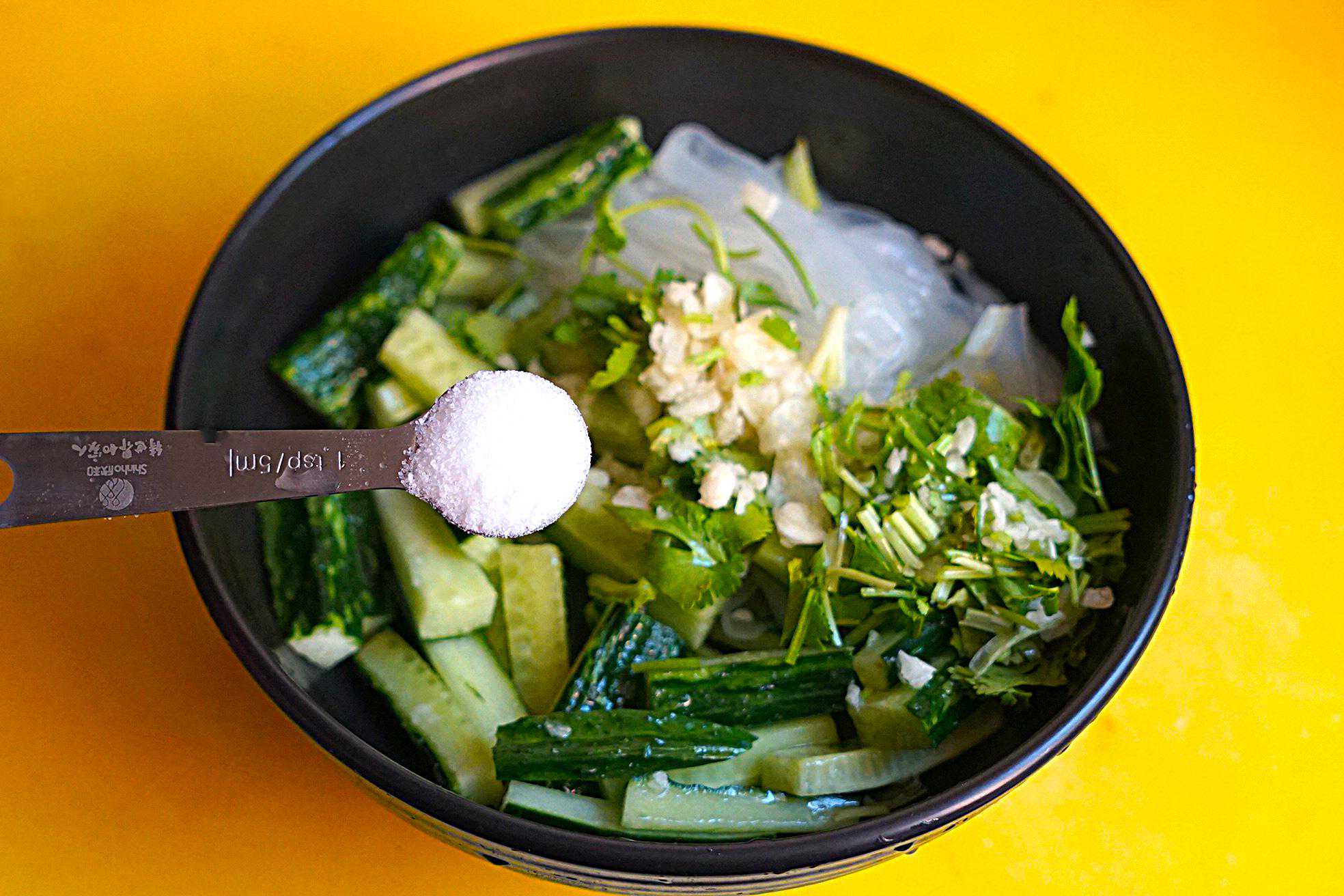 6、将凉皮、黄瓜、香菜、蒜蓉都放入一个大碗中,加入盐颠一颠,筛均匀后腌制2分钟。