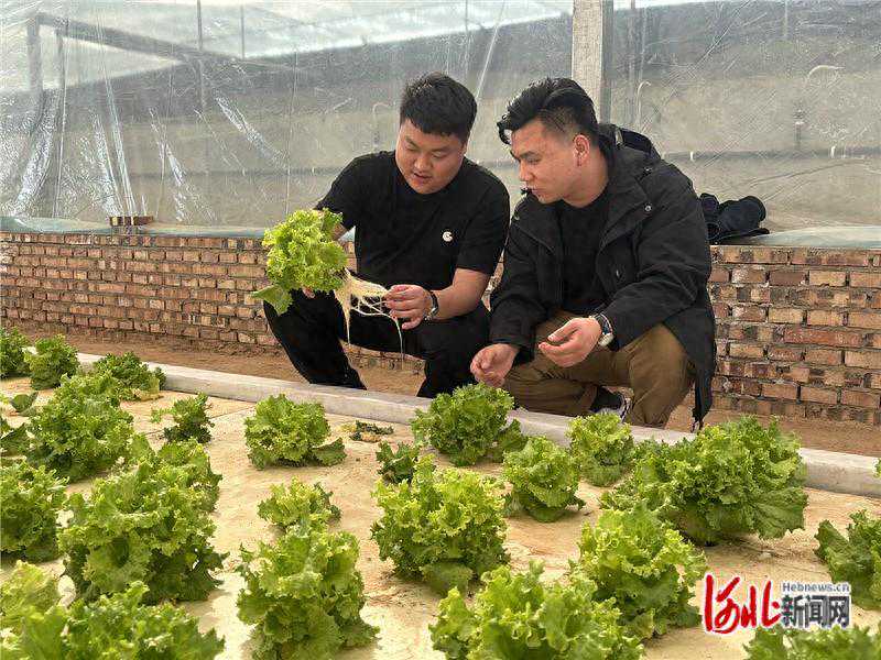 良丰晓月养殖基地的智能温室里,各类蔬菜长势喜人。培育蔬菜的水,就来自旁边的养鱼池。图为3月14日,良丰晓月负责人梁卓(左)正在和同事查看蔬菜的生长情况。记者李巍摄