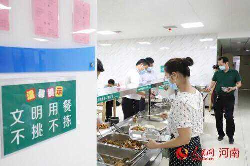 8月24日中午,宝丰县政府机关食堂就餐人员排队按需取餐。张明哲摄