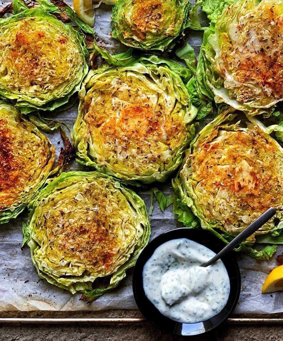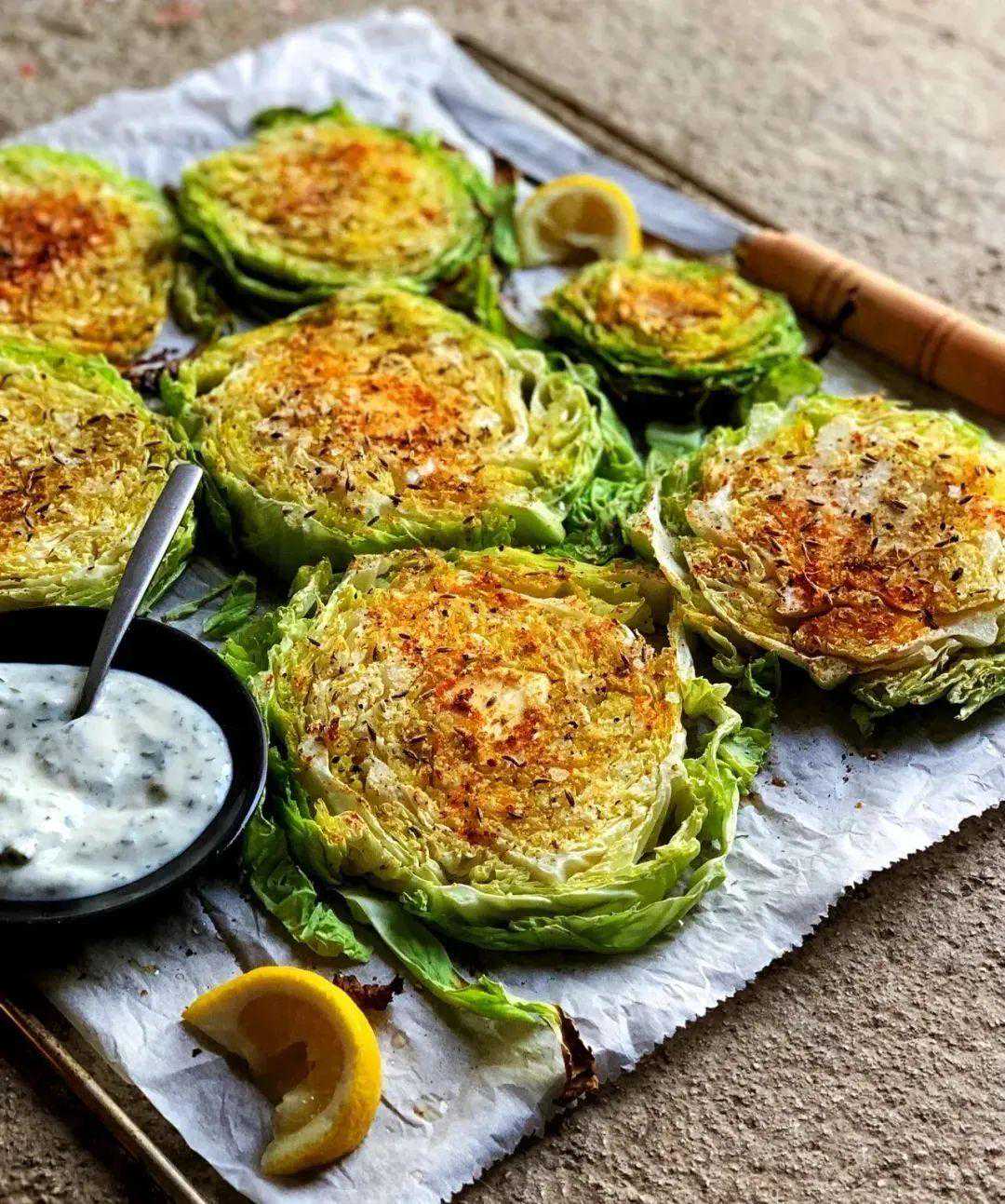 最后抹上用2勺白芝麻酱、半勺孜然粉、少量蒜末、盐和清水混合而成的蜜汁蘸料,分分钟干完1颗卷心菜!