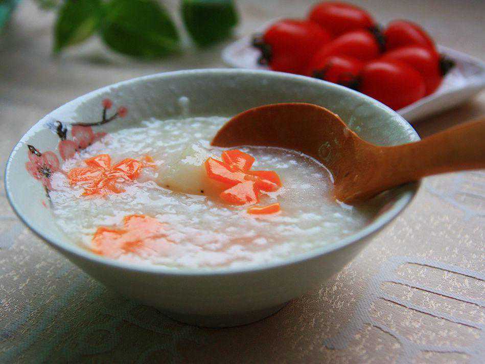 (4)粥快要熬好的时候,加入胡萝卜和鳕鱼一起熬煮片刻,然后就可以了。