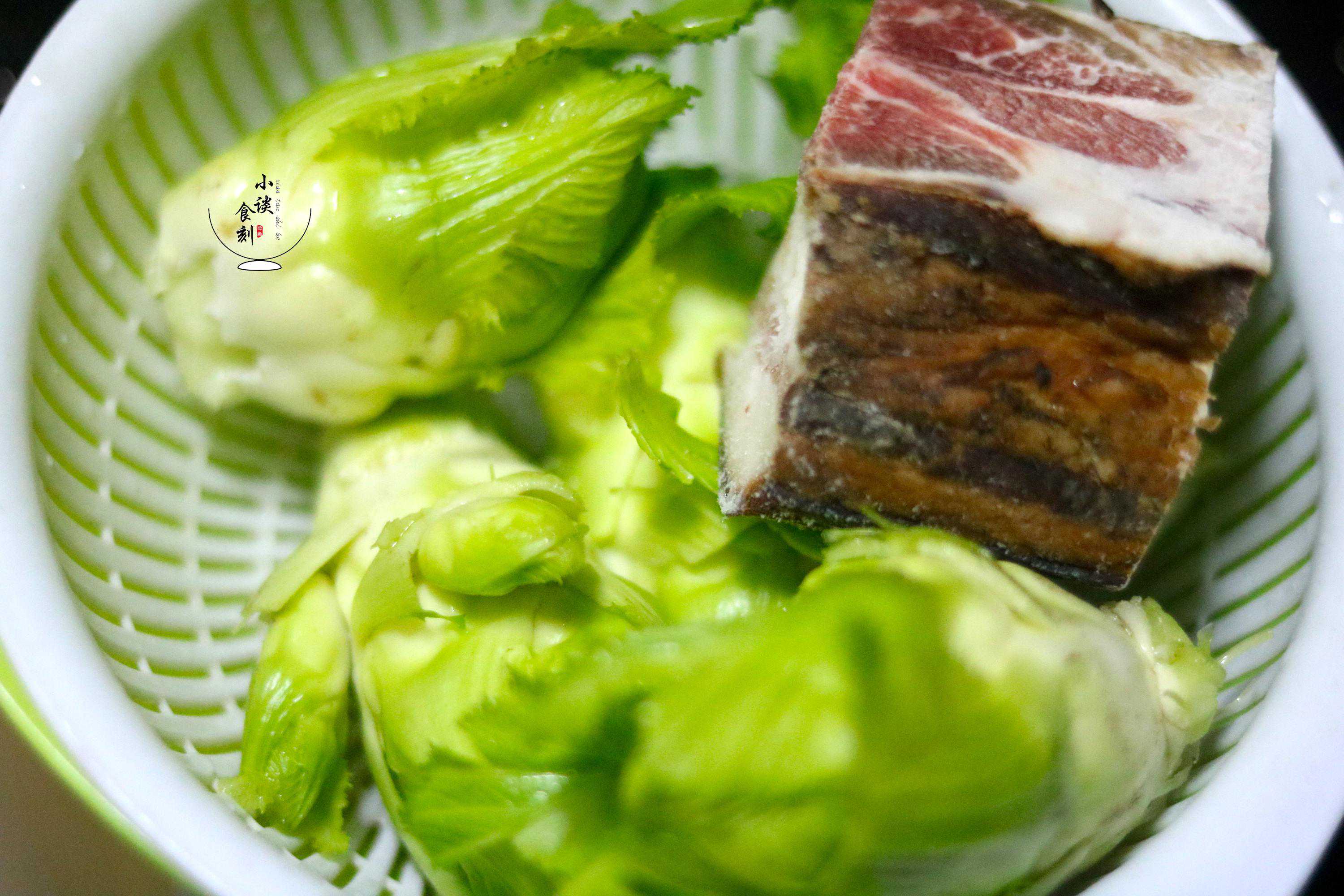 1、腊肉清洗干净,我们可以选择那种烟熏的腊肉,它带着香味,浸泡或者焯水之后,把它切成薄片。