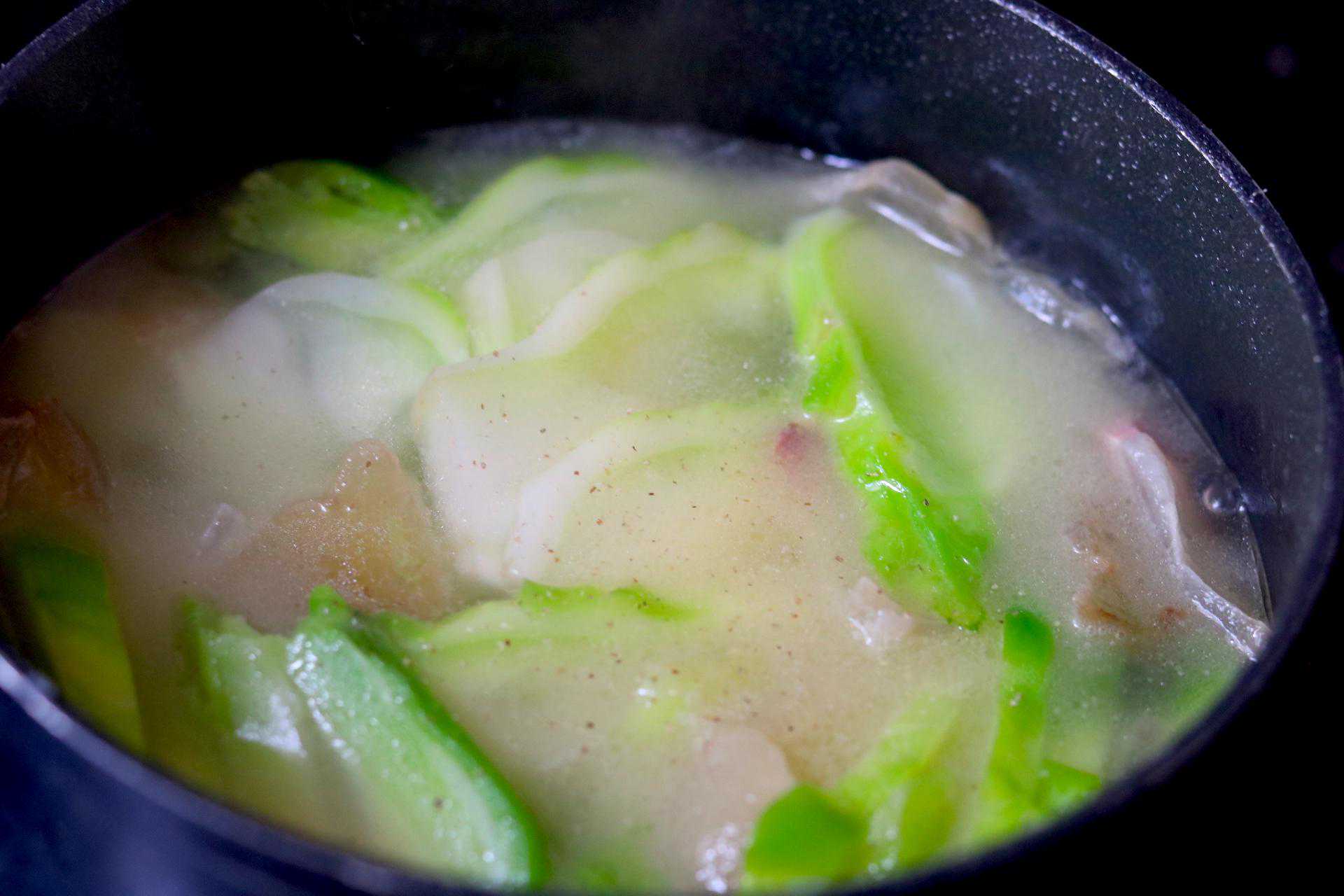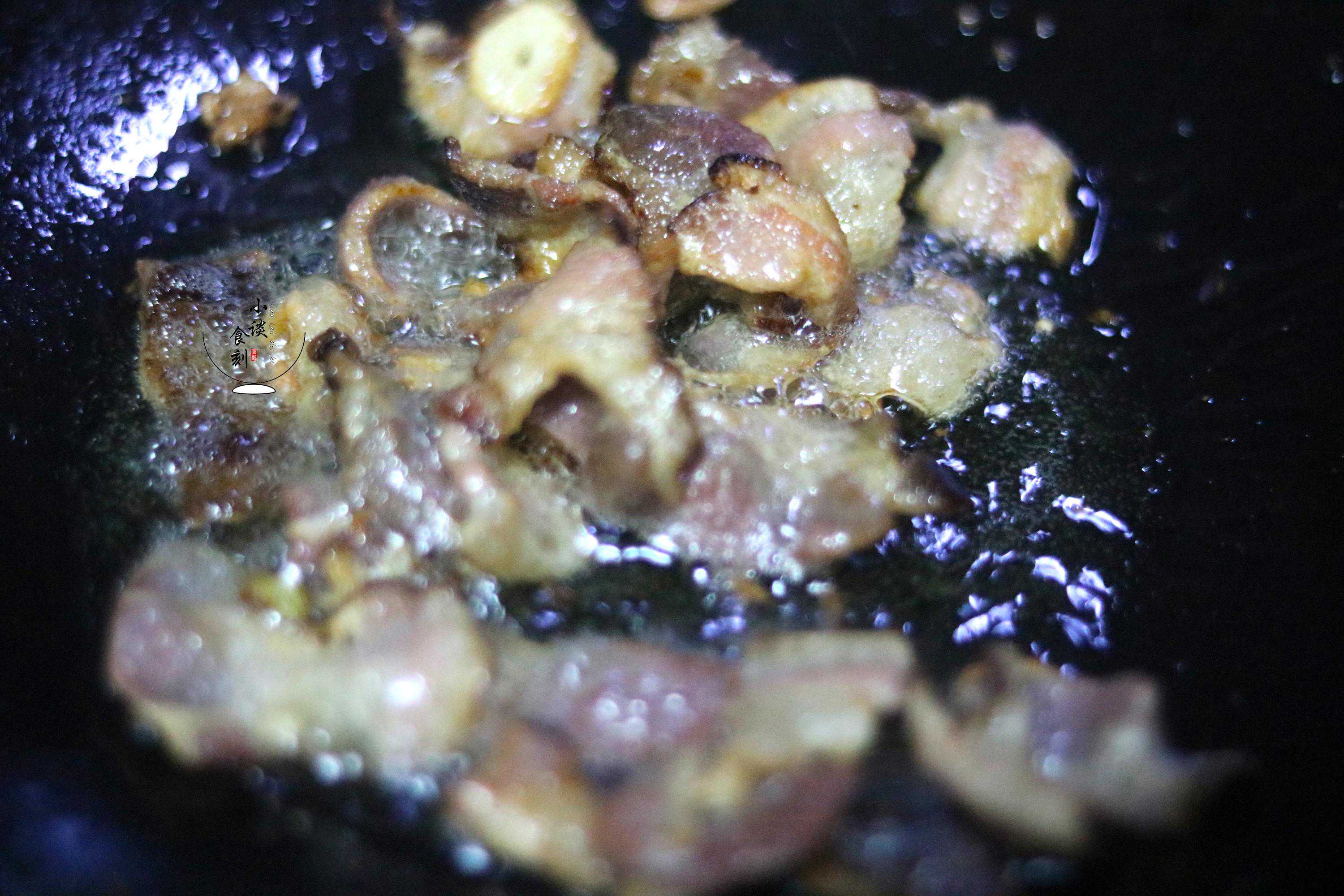 2、准备一块处理好的腊肉,然后切成片炒香,放入开水,开始煮,沸腾之后,放入我们处理好的儿菜。