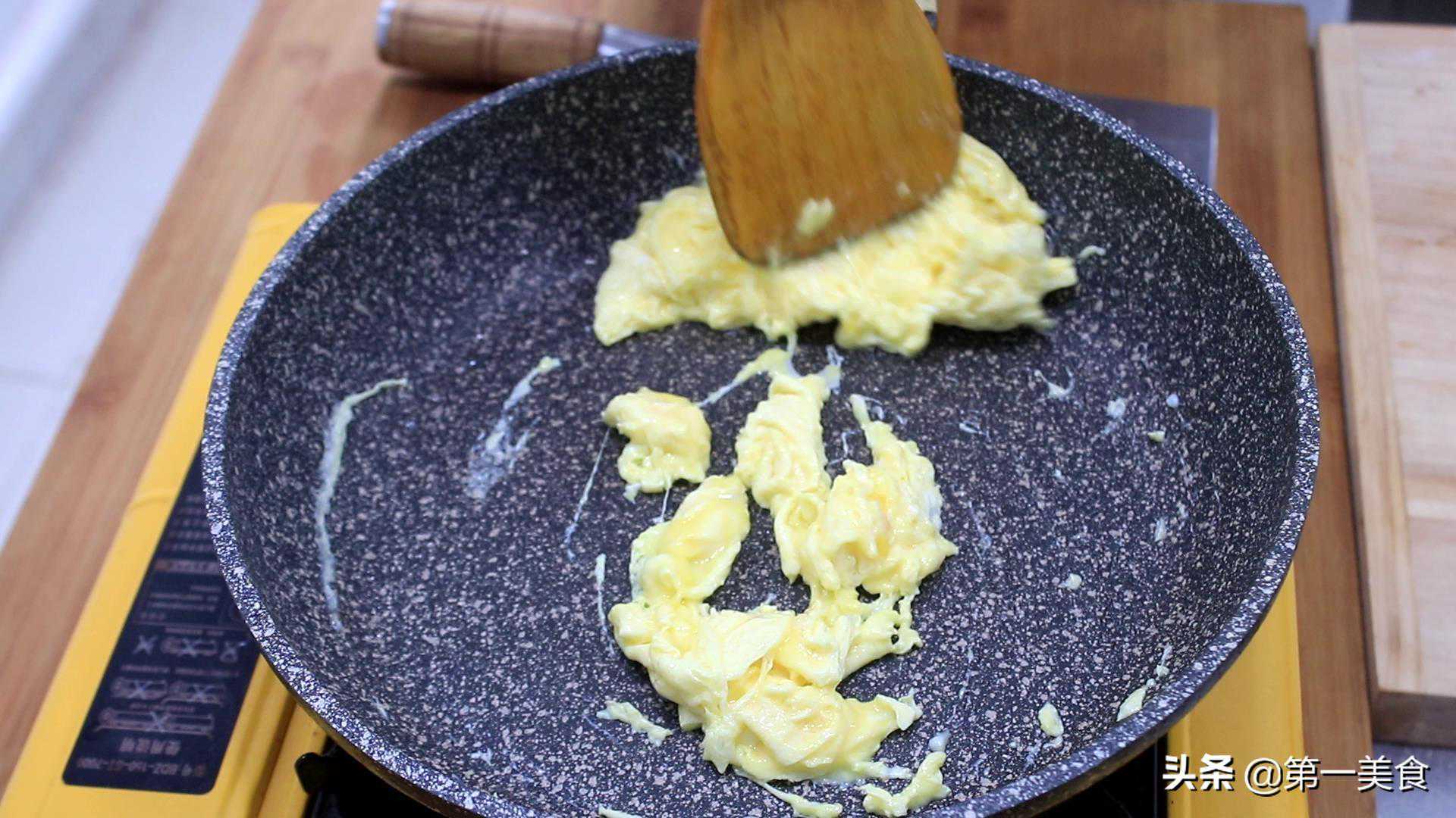 锅内烧油,我们把鸡蛋煎一下,油热以后,倒入鸡蛋,煎至金黄成型,搅碎后倒出。
