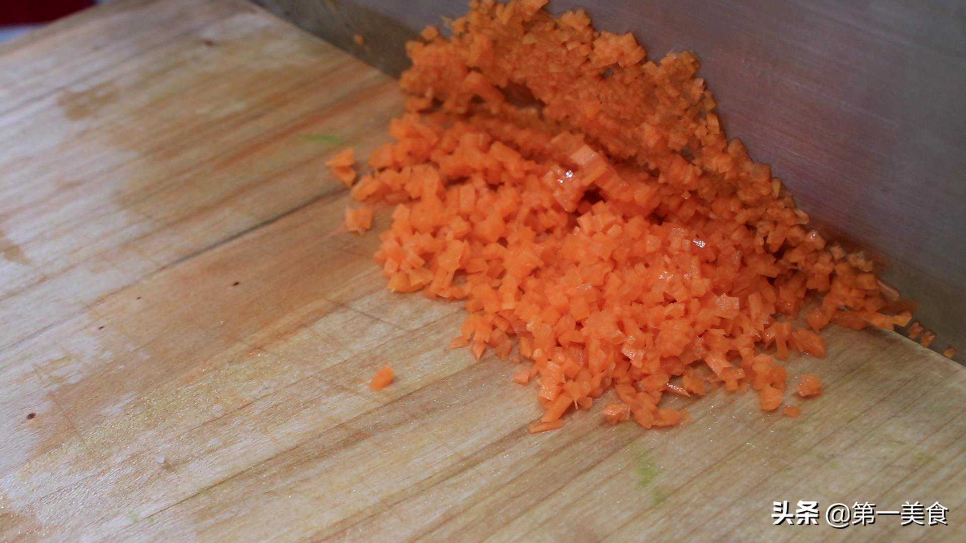 胡萝卜先切成薄片,再改刀切成细丝,最后切成胡萝卜粒放在盆中