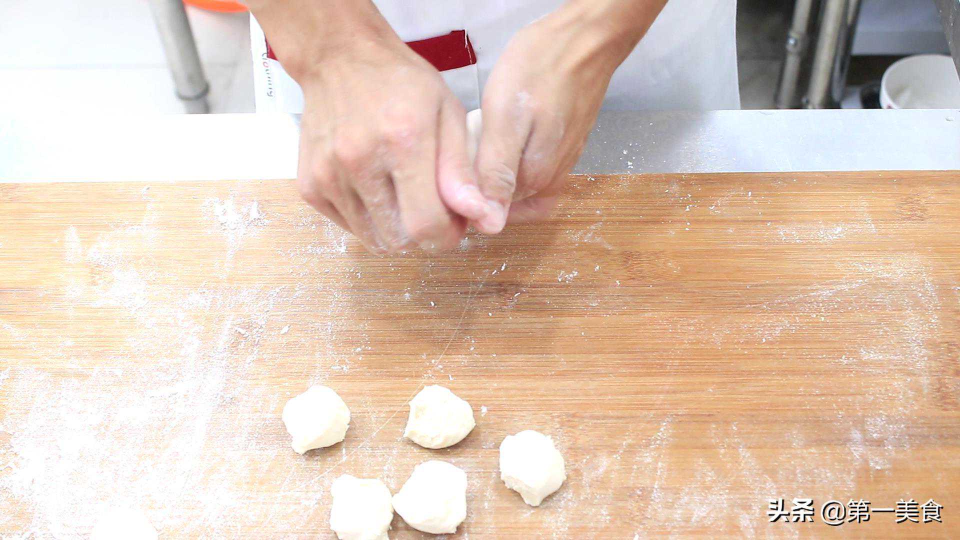 20分钟以后,我们取出饧发好的面团,放在案板上揉一会,用刀切开,分成两块,先把一块面团搓成长条,用手揪成一个一个的小面剂子。
