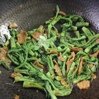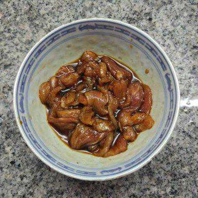 1、猪肉切薄片,放入适量生抽和少许淀粉,搅匀后,腌制10分钟左右。