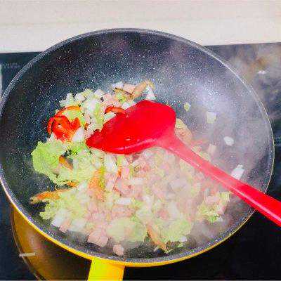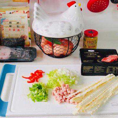 1、准备食材(几根红椒丝、三片白菜、两根芹菜、两片山姆买的午餐肉、一把刀削面)