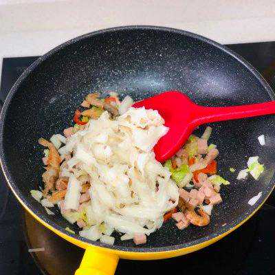 6、把刀削面倒入锅中,一起翻炒,如果觉得味道不够可以放点点耗油
