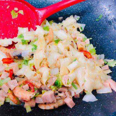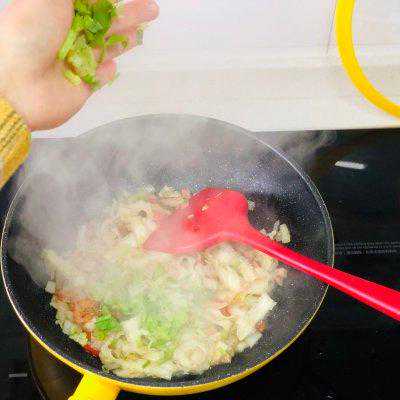 7、等所有的刀削面都炒透了,就可以把芹菜粒放入锅中翻炒