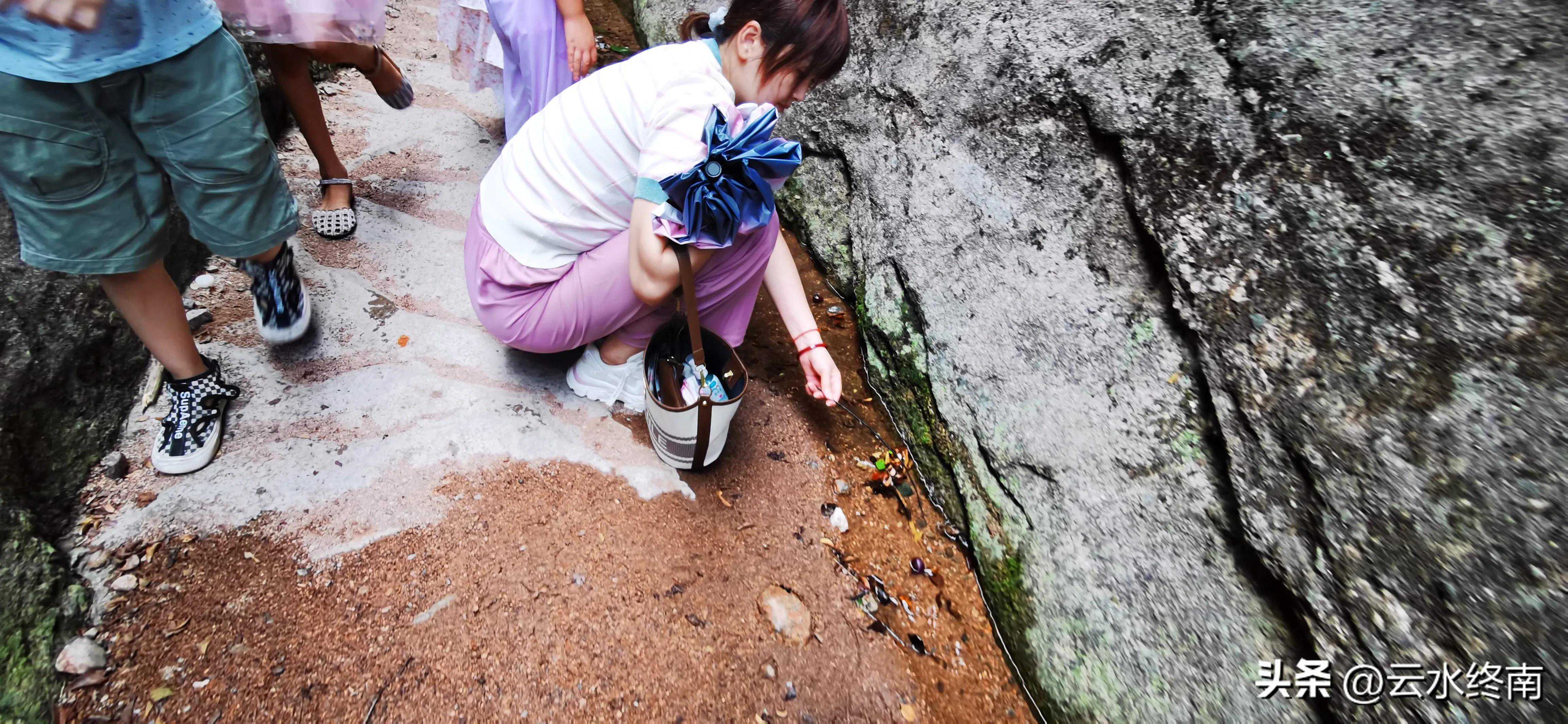 谷底流水清澈,有小朋友在里面找青蛙。