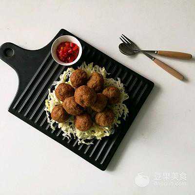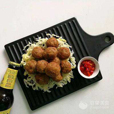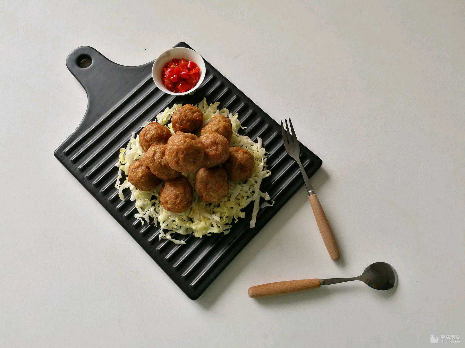 10、复炸一次,色泽金黄。炸好的丸子像乒乓球一样弹力十足,触桌面能弹起。