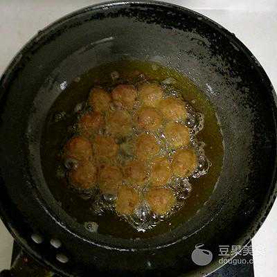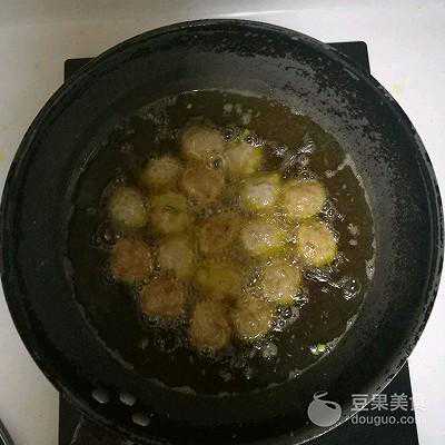9、热油开炸,虎口抓馅挤丸子,中大火炸定型后,调中小火炸制熟透浮起,中途用锅铲背轻推丸子,使翻滚而受热均匀。
