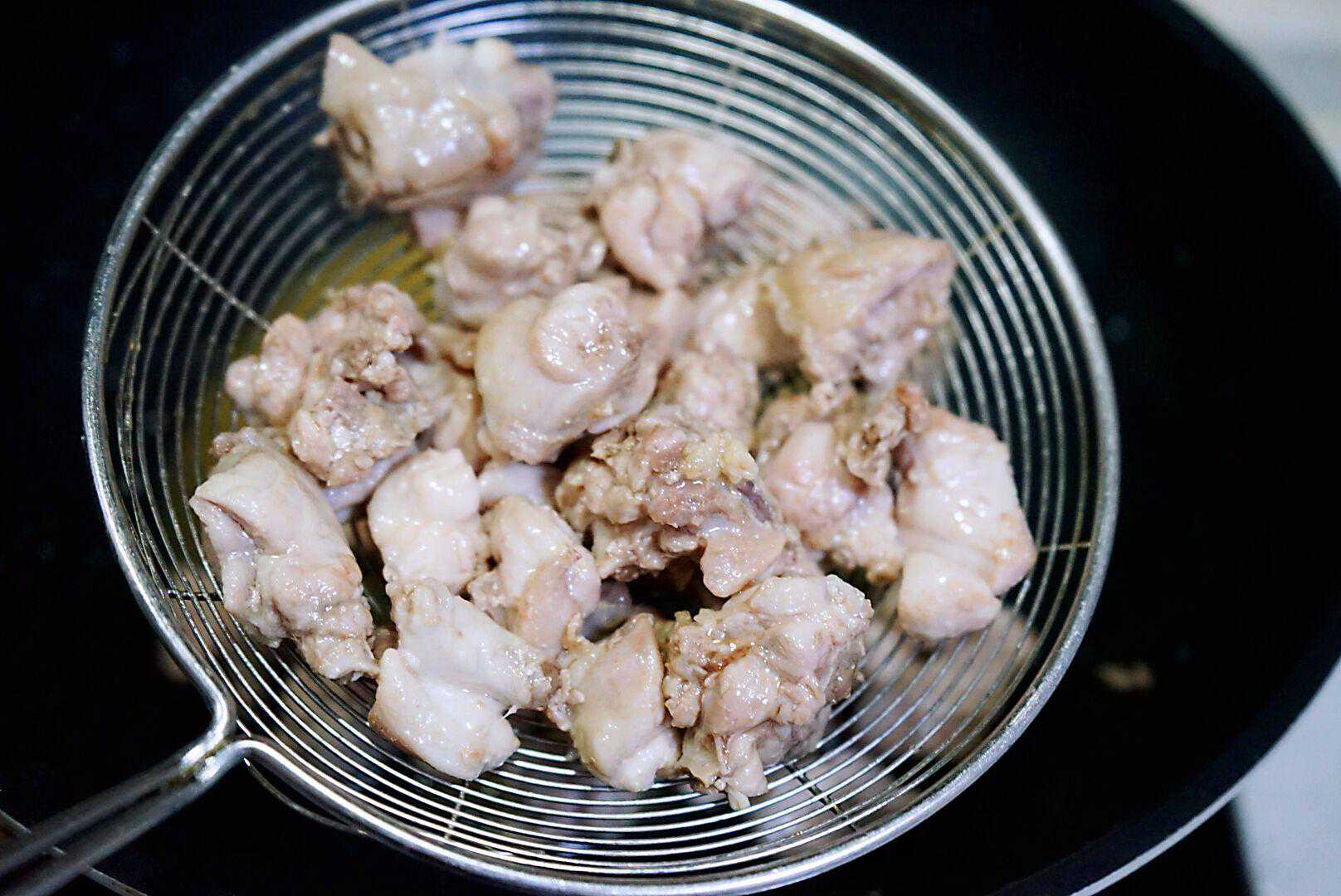 2、炒锅内放入适量食用油,烧到六成热后倒入切好的兔肉块,用笊篱慢慢拨散,过油时间不要太长,2分钟即可过滤后盛出。