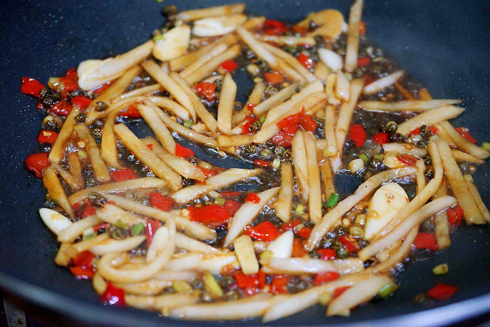 3、另找一个干净炒锅,倒入适量食用油,烧热后倒入姜丝葱末蒜片和麻椒,快速翻炒爆香。这里我本来准备了小米椒,先生觉得太辣了,我就换成了一大勺的剁辣椒,倒入一大勺料酒炒匀。