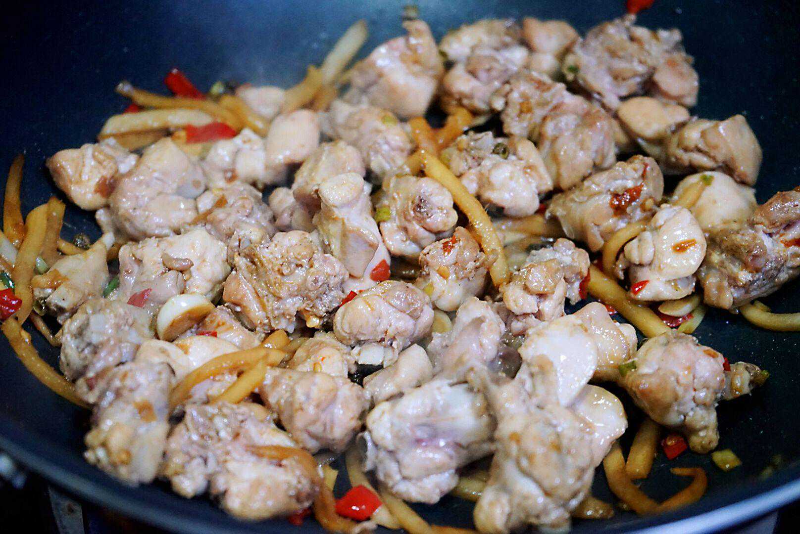 4、接着倒入炸好的兔肉,来一大勺生抽、少许盐翻炒2分钟。
