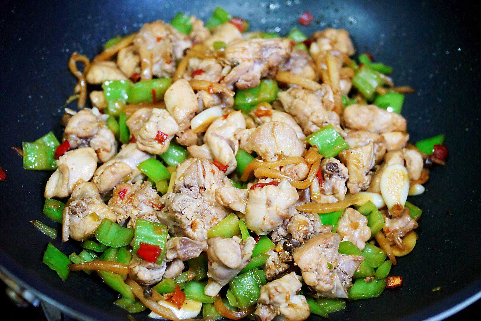 5、最后倒入青椒丁,炒匀后一分钟左右即可出锅。