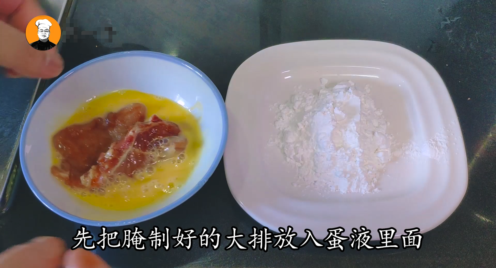 5、把一个鸡蛋打散备用,在盘中放入2勺生粉,热锅倒油,先把腌制好的大排放入蛋液里面,拿出裹上一层生粉,油温升至七成热时,放入大排炸制两面金黄捞出,炸大排油温一定要七成热,否则油温太低生粉容易脱落