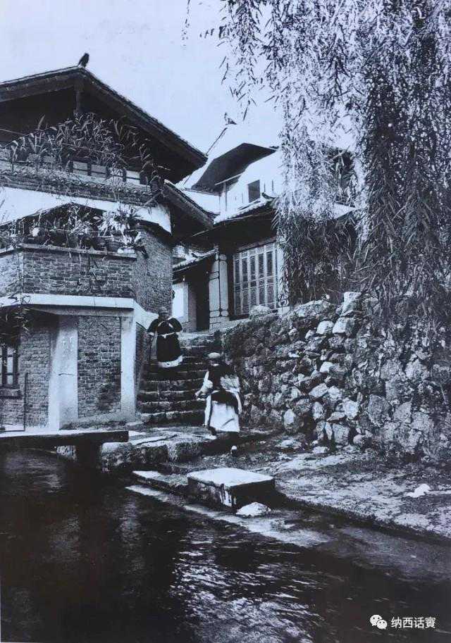 现在再来讲讲“伍柏”。“伍柏”现统称新华街,它就是与“伍古”互为垂直的那条横街。“伍柏”的景致的确迷人,铺面及民居院落,一边靠狮子山,一边临平坝,清沏的西玉河水欢快地从中间穿过,把这条街道自然地分成两半,河上的座座古栗木桥又把两边联为一个整体,河两岸的垂柳,不时有一株株蔷薇爬上枝头,浅红和嫩绿相间,美在其中,正好衬托出纳西人那幽雅和浓淡相宜的审美情趣。我外婆的娘家就在伍柏,儿时常跟外婆到她的娘家,那依山坡水流而建的错落有致的院落,上排出门要下坡,下排出门要爬坡,打开后门,就是清幽幽的河水和红花绿柳,还有河那边绿油油的菜园,常常让我不愿回家。其实这就是“雪山十二景”之一的“玉河烟柳”一景。人们在河边边洗濯、边聊家常,洗了衣服就地晾晒在河边的树蓬上,门常开着不用上锁,老年妇女们常坐在大门石墩上闲聊,中年妇女则常常三三两两一起打手工辫子(用作衣服上的装饰)或刺绣……这一幅幅“伍柏”昔日的风景,今日犹存。