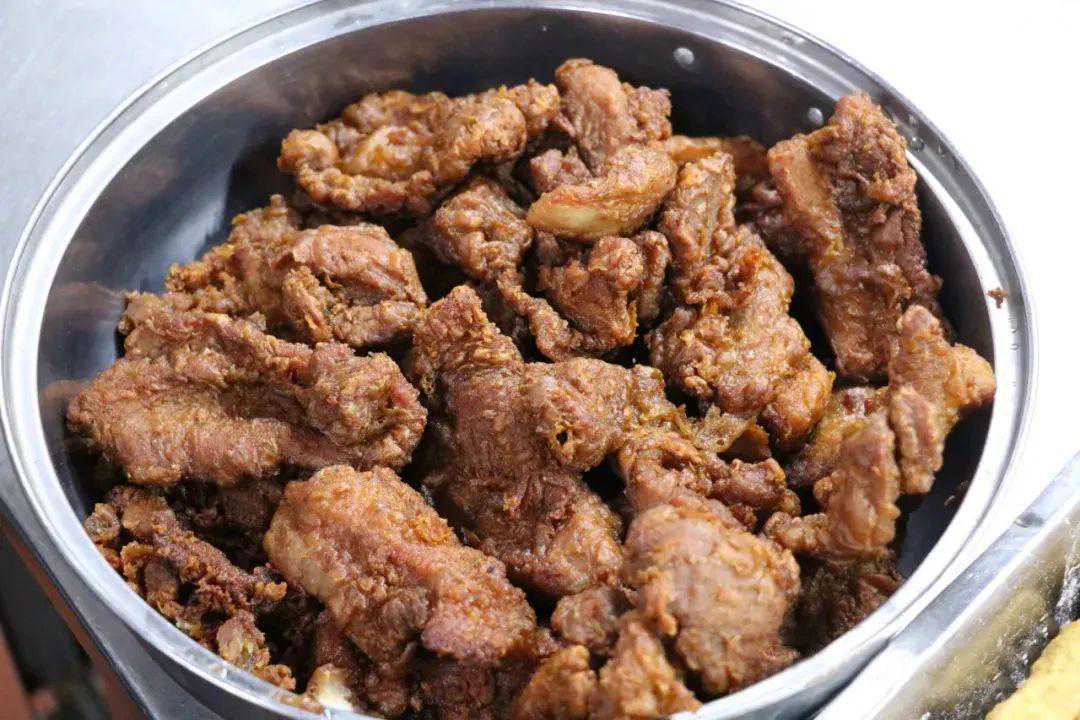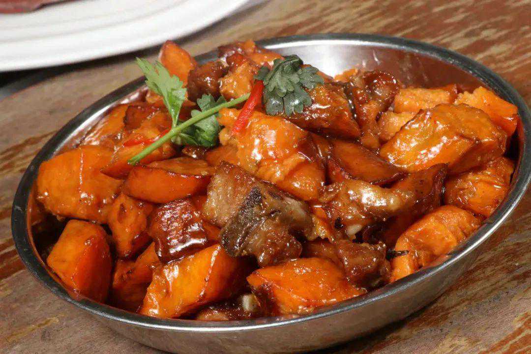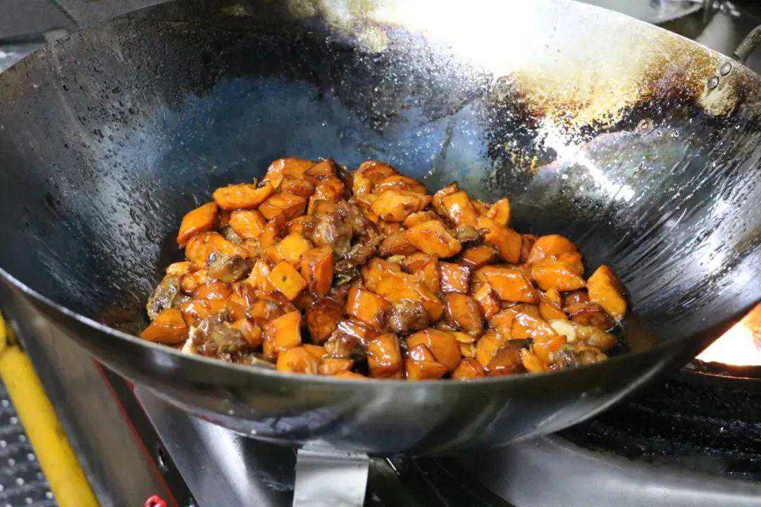 此菜选用广西本地的红心番薯搭配炸排骨,成菜显得分量十足。而原本两种炸货搭配带来的些许油腻感,也被咸甜酱汁很好地中和,呈现出粉糯甘甜与焦香酥脆的味觉碰撞,诱人食欲。