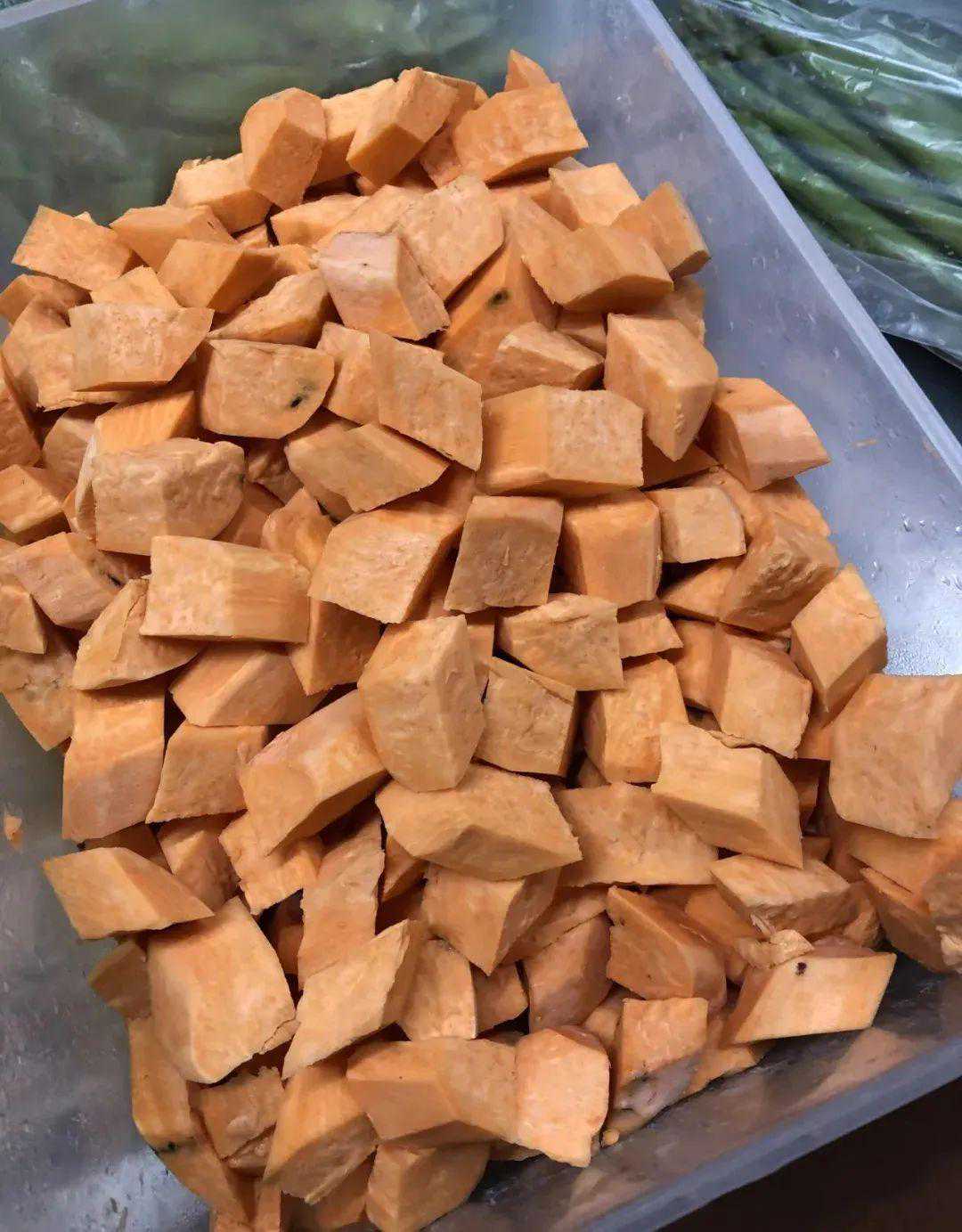 2.红薯洗净去皮,改刀成2厘米见方的小块。锅入宽油烧至七成热,下红薯块小火慢炸至边缘微煳,盛出滤油备用。