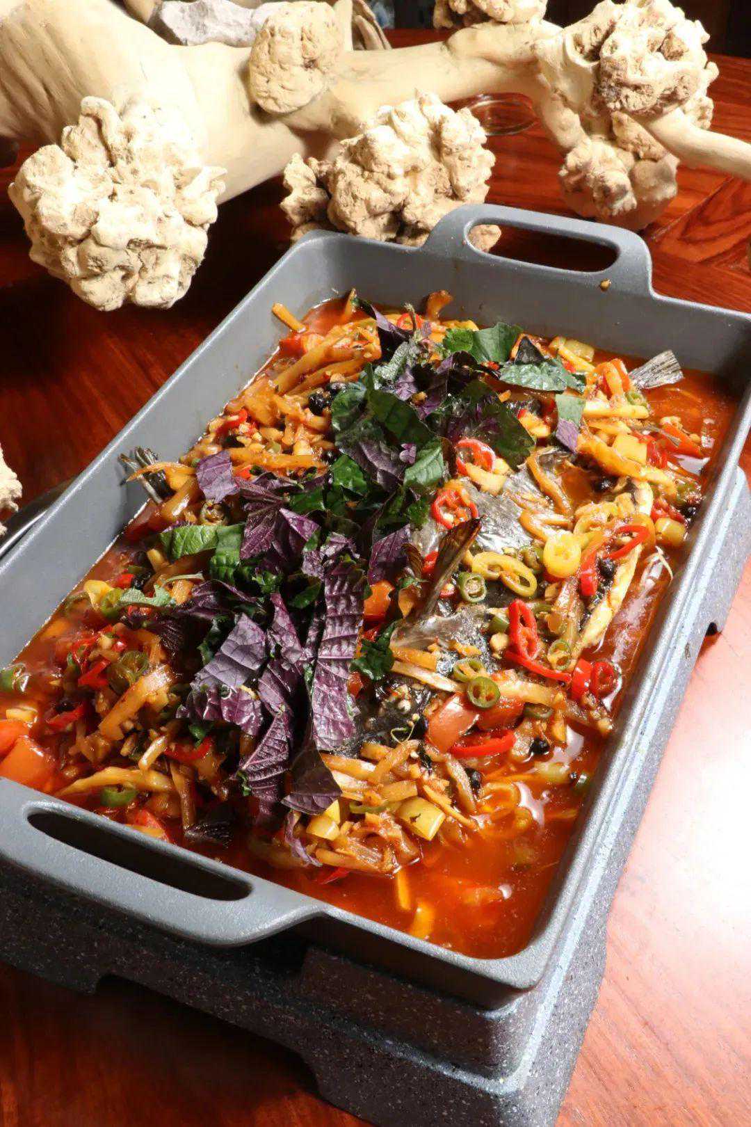 “瑶长府”的这款鱼热卖亮点有三:首先,选用剑骨鱼为原料,其生活在漓江边峭壁下,以小鱼、小虾、螺蛳为食,嘴宽、无鳞、有须,跟鲶鱼有几分相似,肉质肥嫩,通身只有一根大骨,且久煮不烂;其次,制作时,整鱼先入烤箱加热至断生,再摆入炭火炉烤至全熟,外焦里嫩;最后,以酸笋、豆豉、番茄炒制一锅老友料,出锅前烹入香醋,盖在烤鱼上,酸辣微“臭”的味道诱人食欲。