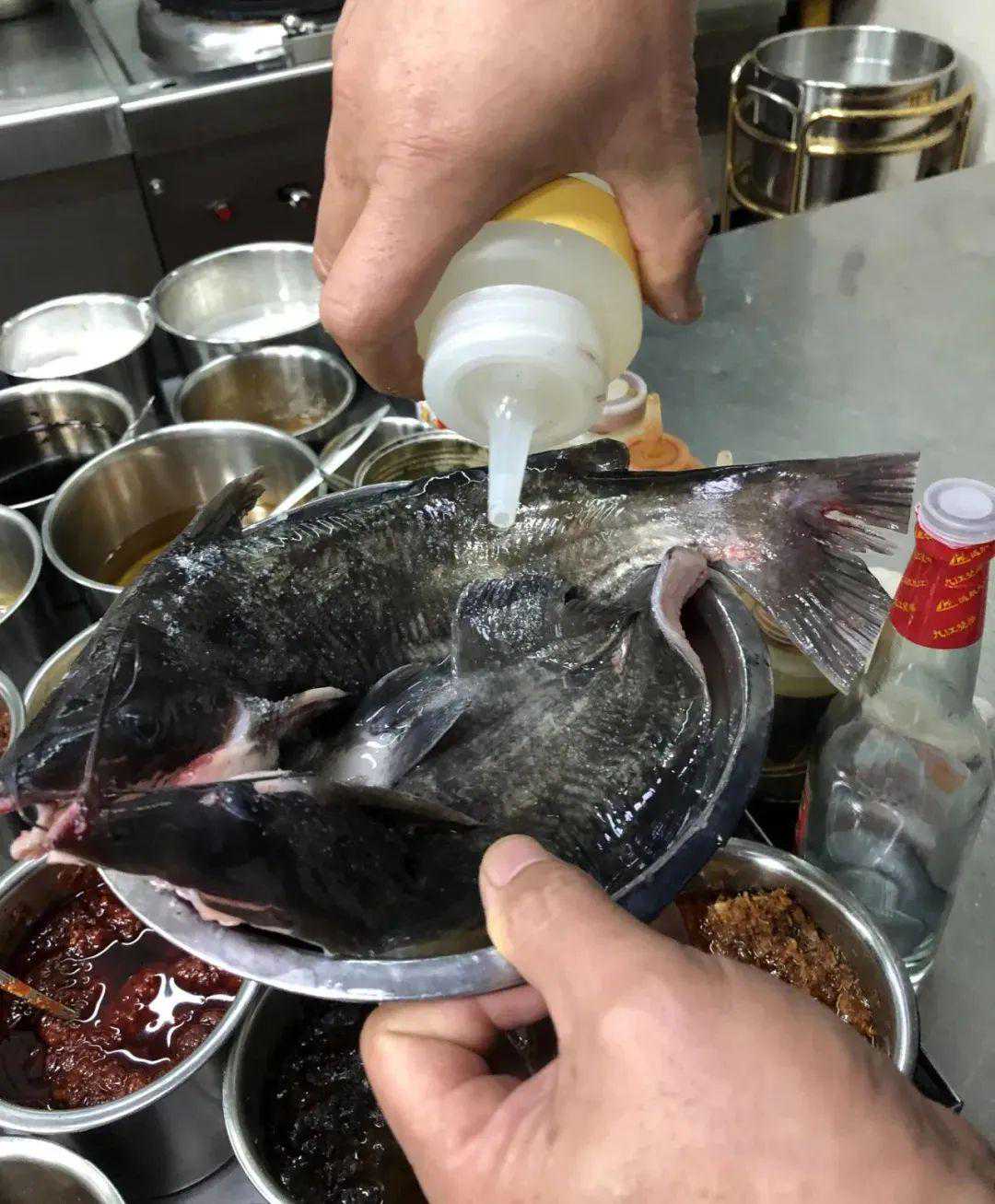 2.在鱼身两侧改十字花刀,淋少许白醋祛腥,放入葱姜盐水中浸泡20分钟补味。