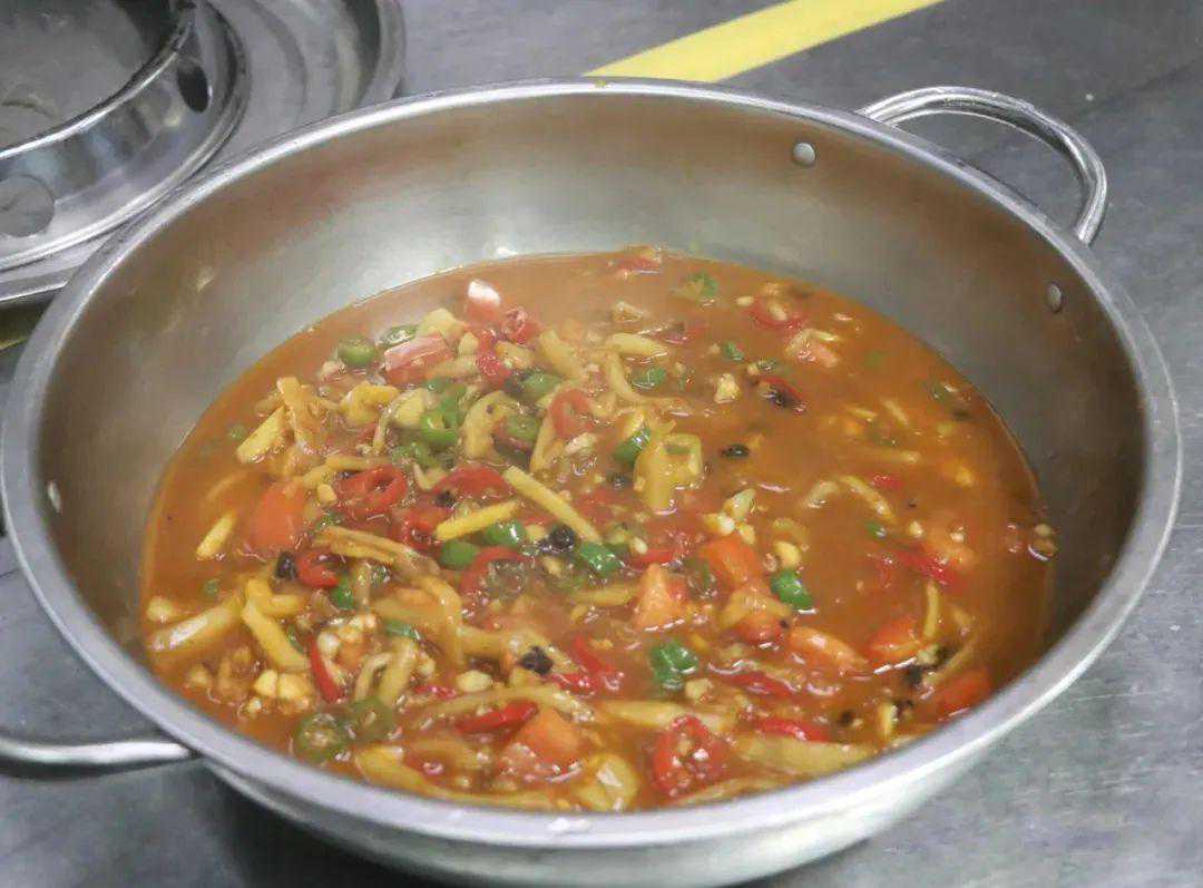 6.锅入花生油80克烧至五成热,放蒜米100克、扬美豆豉(色泽黝黑,豉香浓郁)50克、酸白辣椒段60克、酸笋条200克炒香,加鲜番茄丁100克炒出汁水,添番茄汤300克大火烧沸,调入生抽6克、蚝油10克以及适量盐、鸡粉煮1分钟至汤汁浓郁,撒青、红椒圈共50克翻匀,淋香醋25克,起锅浇在鱼身上,撒紫苏碎20克即可走菜。