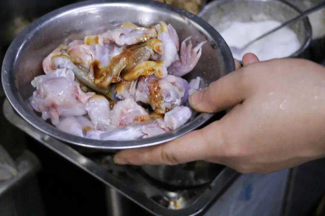 1.牛蛙宰杀治净后加料腌制。