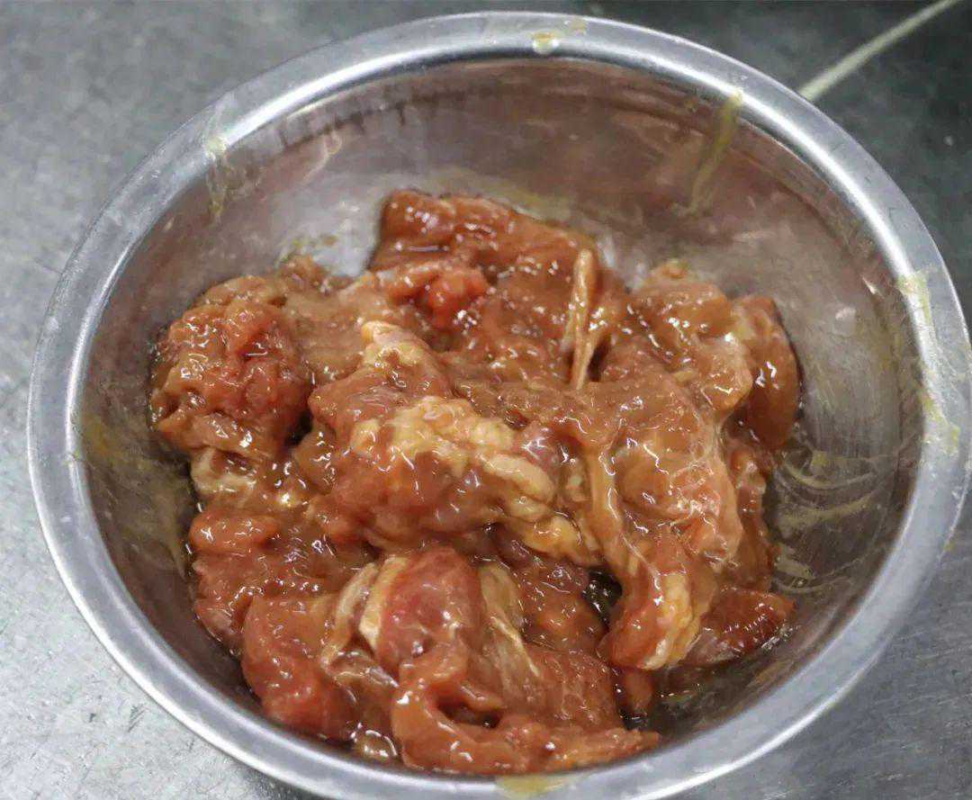 2.牛里脊肉5千克顶刀片薄,依次加木瓜汁500克、生抽20克、老抽20克、白糖15克、鸡精20克、味精15克、盐5克、淀粉200克、蛋清3个拌匀,封一层花生油冷藏腌制6小时以上。