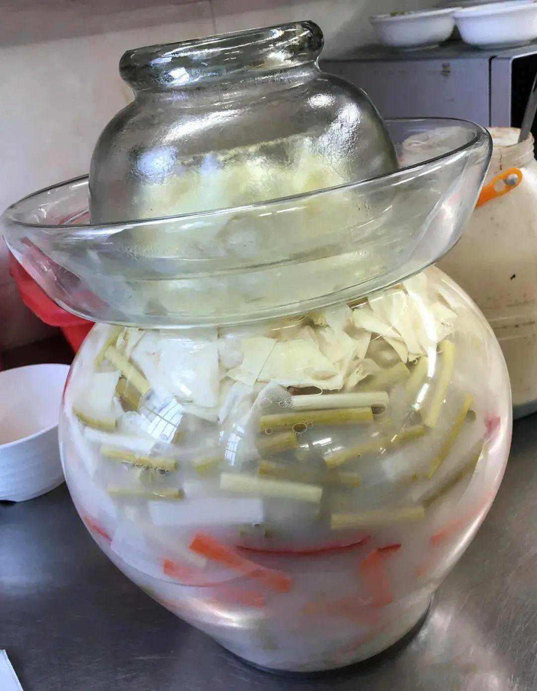 3.胡萝卜、白萝卜、豆角、包菜、青椒、红椒等蔬菜洗净后用厨房纸吸净水分晒至半干,改刀成小块叠放入泡菜坛中,倒入米水没过食材,添桂林三花酒少许,撒盐适量,添坛沿水密封后将泡菜坛摆在太阳下腌制2~3天即可使用。