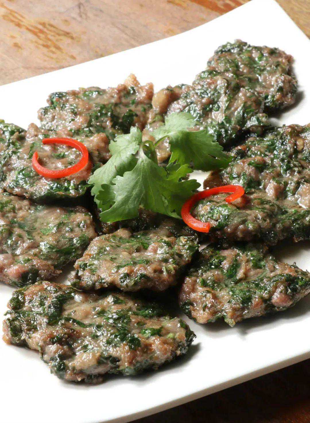 假蒌牛肉夹是广西的特色菜,为了将其香味发挥到极致,这道菜改变了传统用叶片夹肉馅的做法,而是将假蒌叶切碎后拌入牛肉馅中祛腥解腻,成菜外皮香酥、内里嫩滑,是当地食客的必点菜。