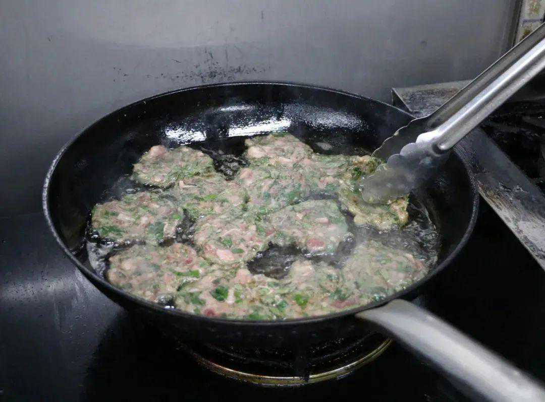 锅入底油,下牛肉丸15个用锅铲压成饼状煎制,不断翻面至成熟即可。