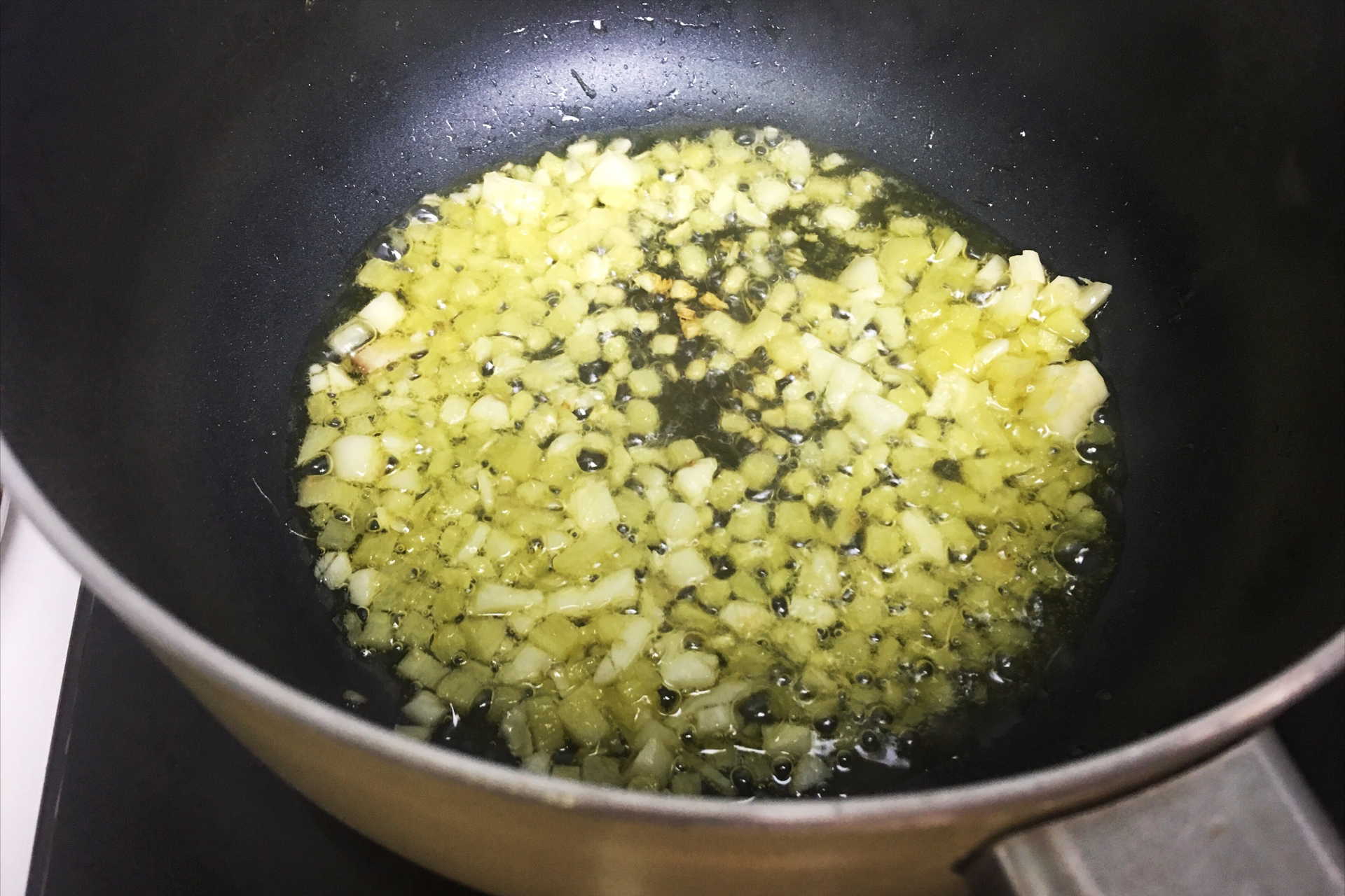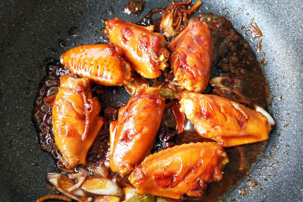 5、把葱姜蒜放入烧开的油中炒出香味,腌制好的鸡翅倒入锅中翻炒至金黄色;