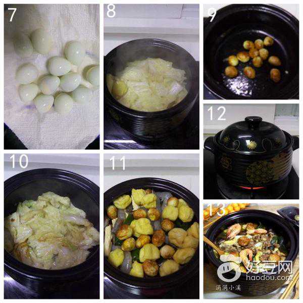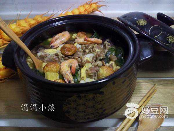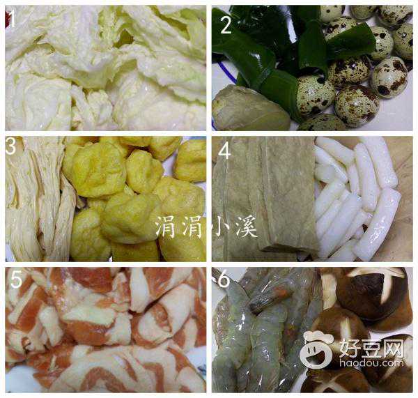 大白菜叶200g海虾130g油豆泡100g腐竹50g鹌鹑蛋100g羊肉片300g海带结150g年糕150g
