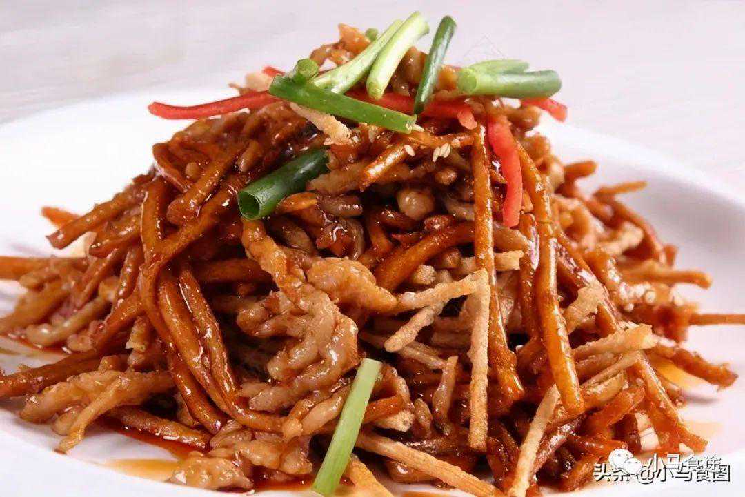材料:猪肉(二粗丝)、大葱丝、白糖、酱油、生粉、胡椒、料酒、香油、甜面酱(加水稀释)、糖色。