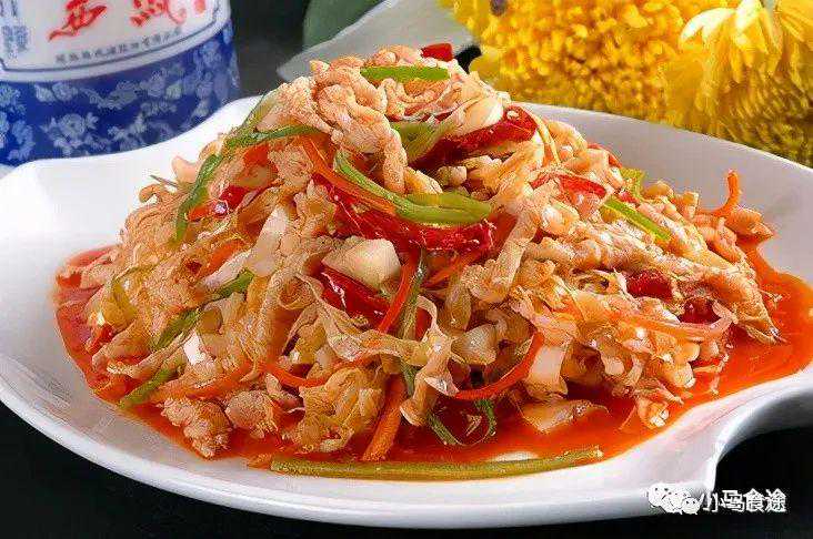3.锅洗干净,放入肉丝,加鲜汤烧沸,撇去油沫,加盐、白糖、八角、糖色(浅红色),用中小火收至肉丝汤汁将干时,放入味精、香油略收一下起锅,凉后加入辣椒油,撒上芝麻油拌匀即成。