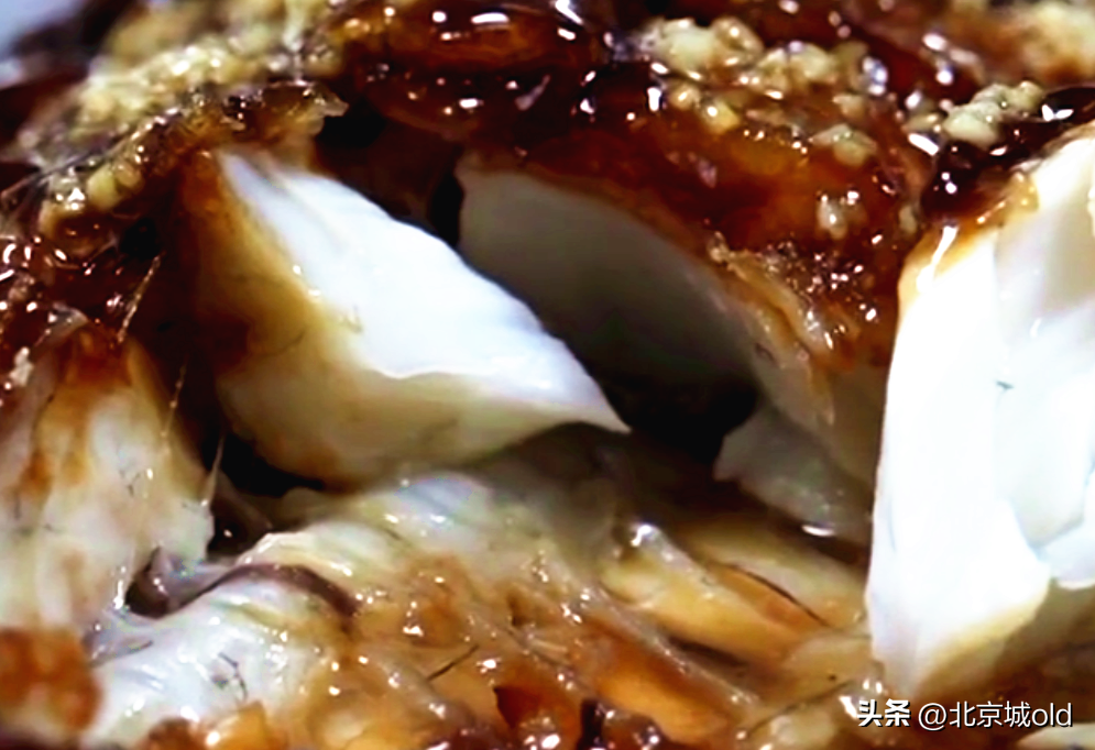用热水烫过之后,鱼没有了腥气,上面的鳞也更容易刮掉,接下来还要在鱼身上划上几刀,为的是让鱼更入味儿,而让鱼头变成螃蟹肉的绝招儿就是姜末儿,这道菜最离不开的一种调味儿,平时北京人吃螃蟹,总是要用姜醋调汁儿,再加上鱼肉做的特别细嫩,所以吃到嘴里自然就有了螃蟹肉的味道。