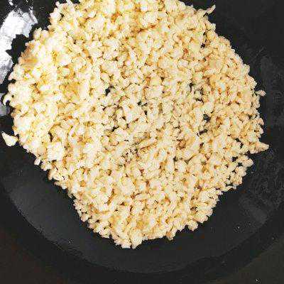 3、取5个鸡蛋打散,锅中放油,油热将鸡蛋滑散,盛出备用。