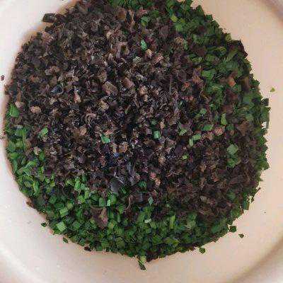5、将韭菜、鸡蛋、木耳放入一个大碗中在加适量虾皮、花生油搅拌均匀。