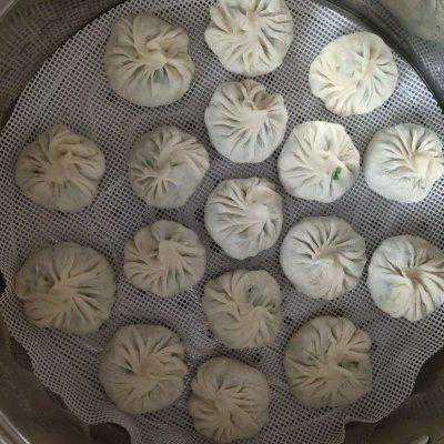 7、将面分成小剂子,擀成薄皮,呈透明状,用饺子皮将馅料包成包子状,上锅大火蒸十分钟即可。