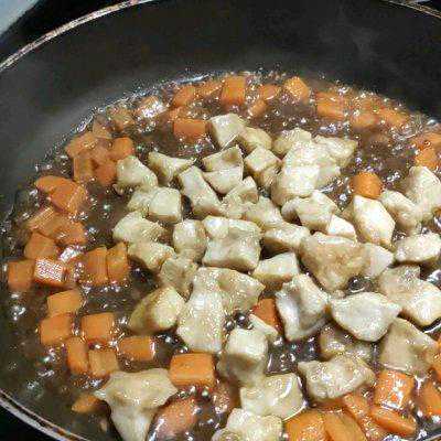 4、胡萝卜去皮,切丁,锅洗净,下底油,翻炒胡萝卜,变软后,倒入酱汁。