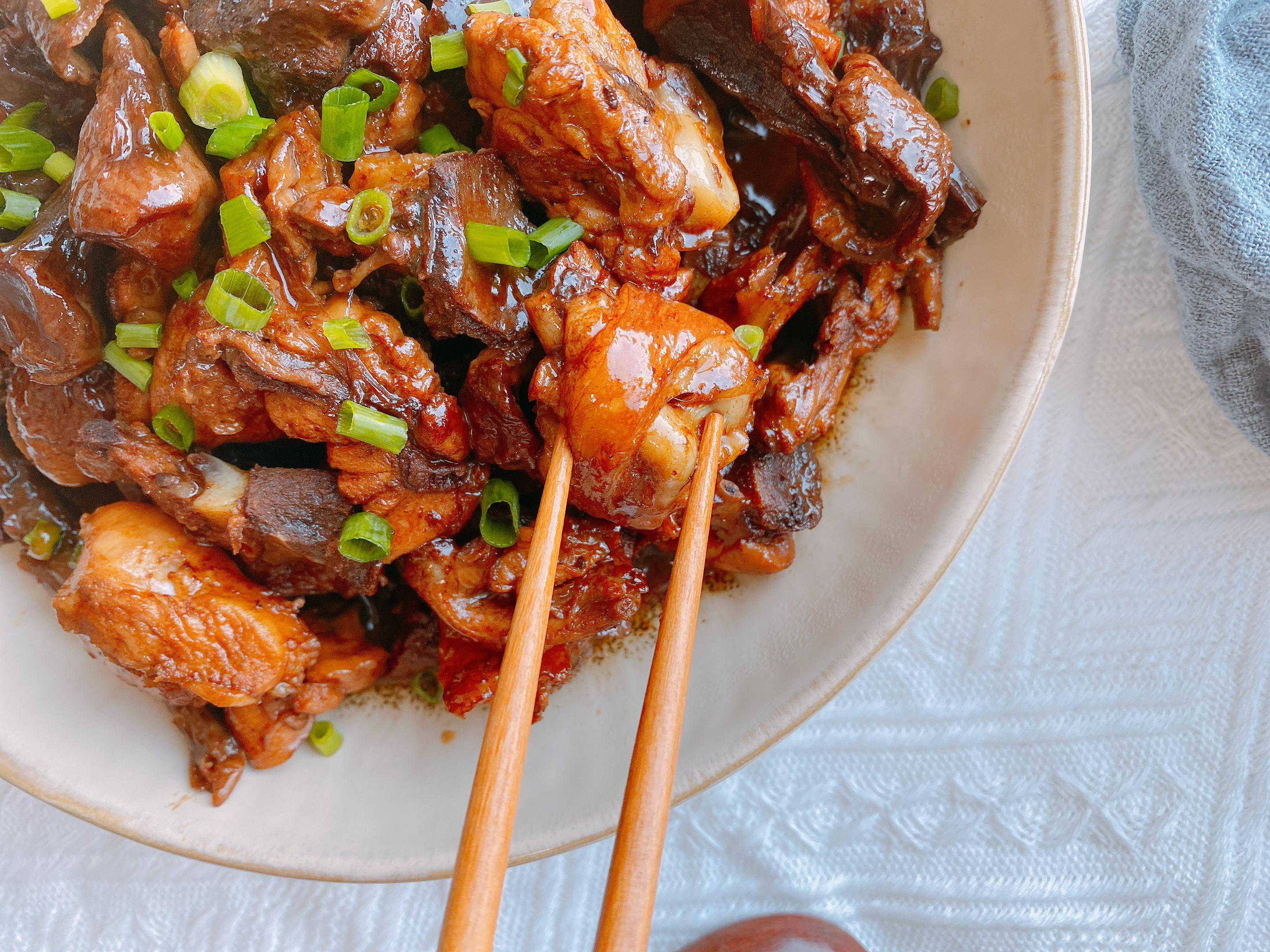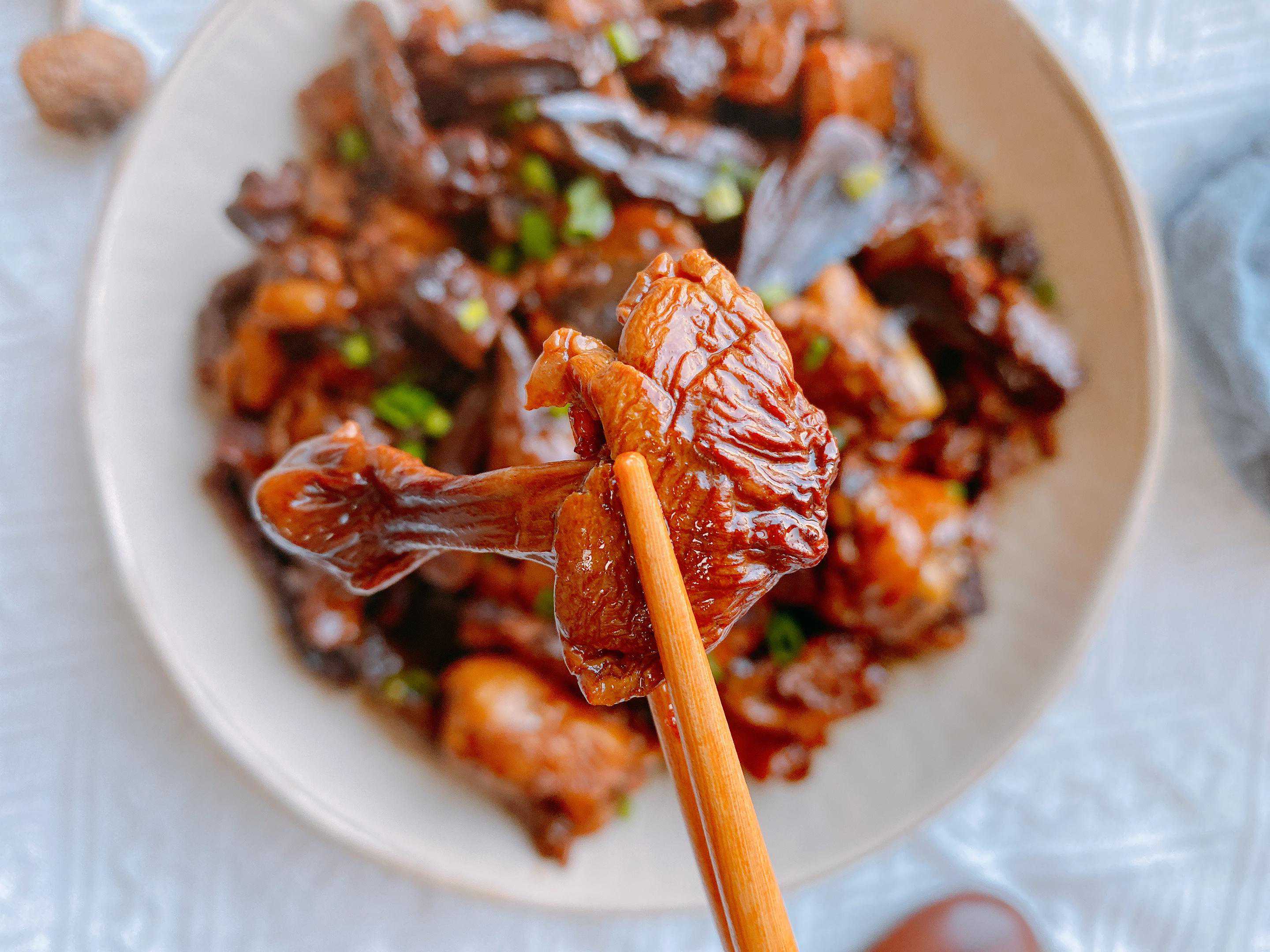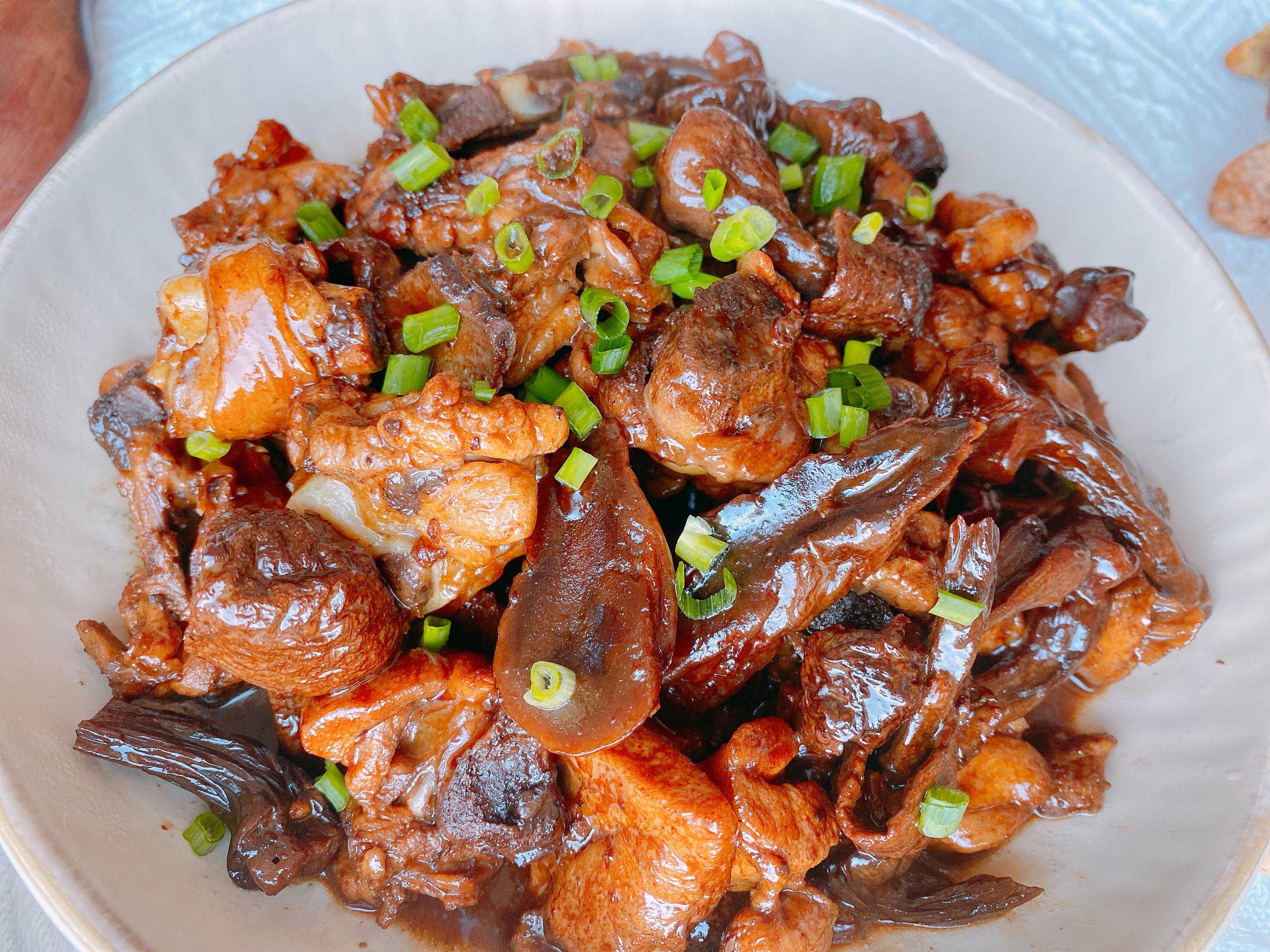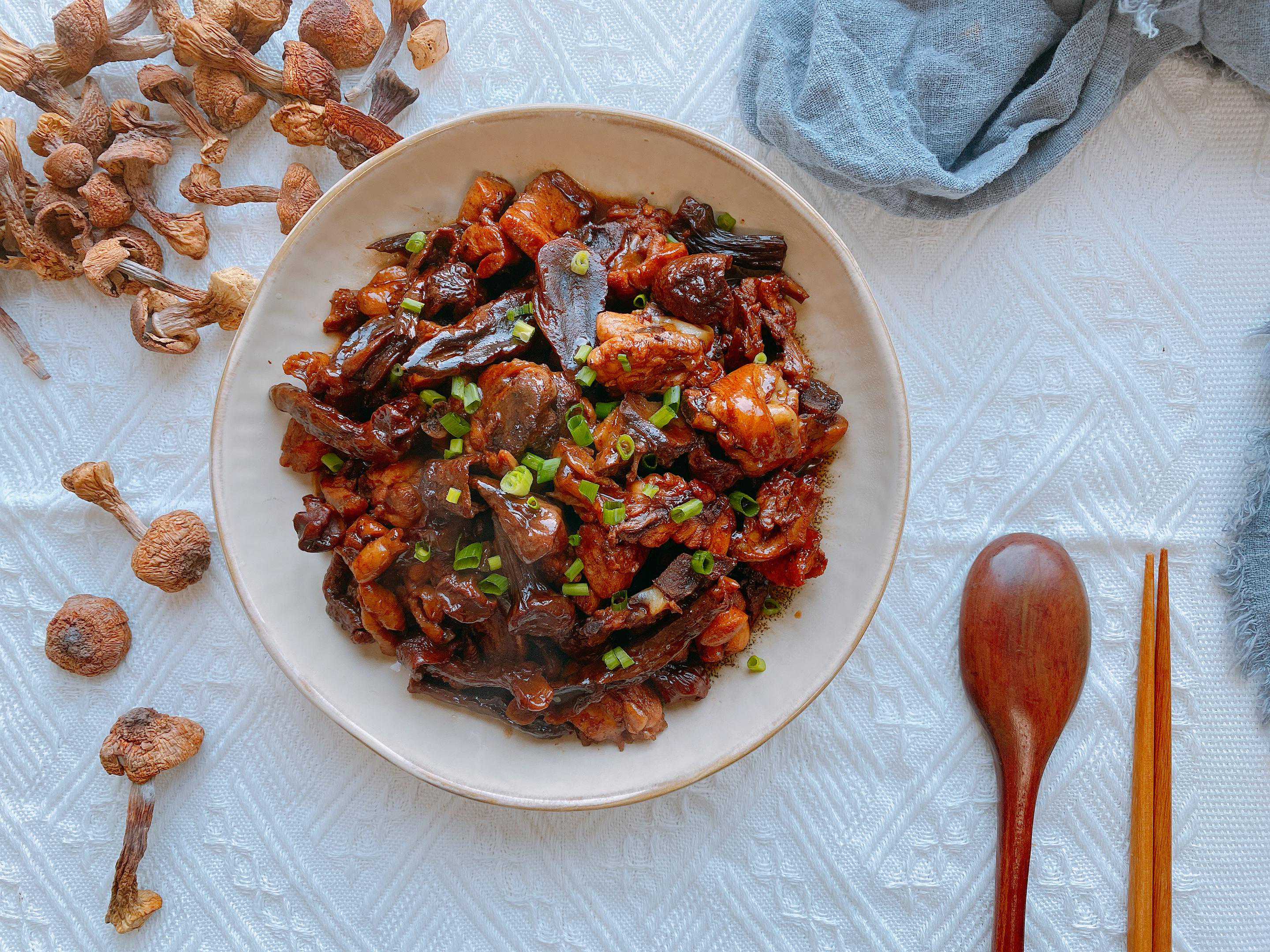 【原材料】姬松茸、鸡腿、生姜、小葱、食用油、食盐、生抽、老抽、白糖;