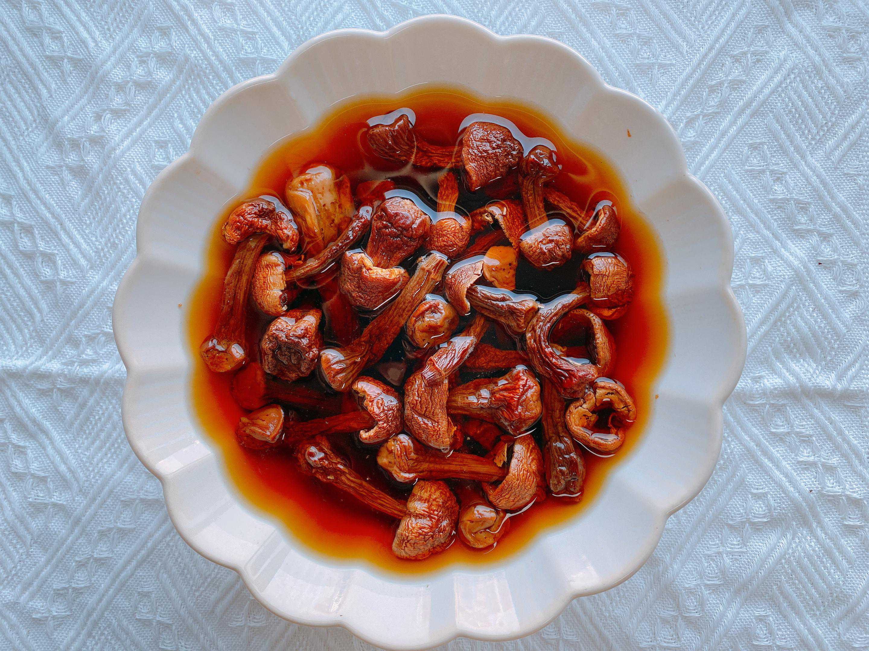 2.准备好的姬松茸放在流动的清水下面冲洗干净,冲洗干净之后放在大碗中浸泡,需要提前1-2小时浸泡,浸泡好的姬松茸的水不要倒掉,后面有用。