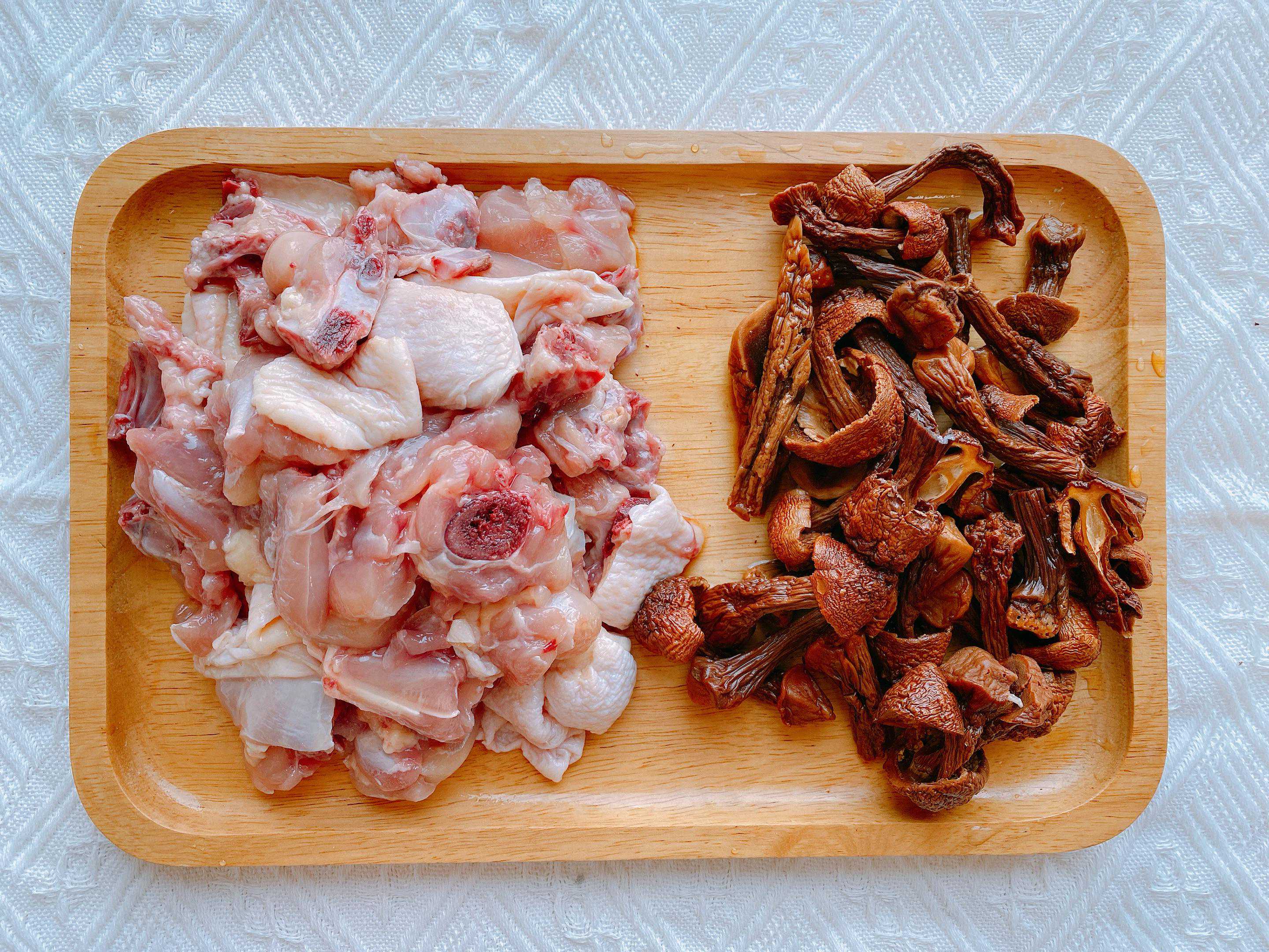 3、浸泡姬松茸的时候将鸡肉清洗干净,也浸泡在水中,这样能减少鸡肉中的血水,吃起来没有腥味,时间到,将鸡肉剁成小块,没有三黄鸡或者半边鸡,用鸡腿代替也是可以的,接着将浸泡好的姬松茸也取出来,大剁的姬松茸稍微切一下。