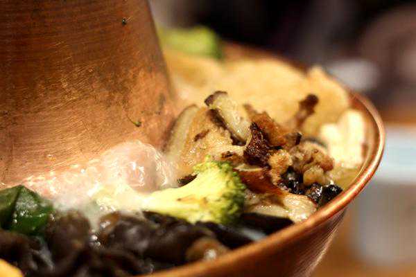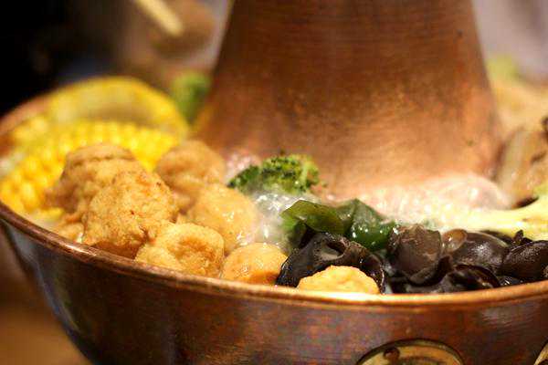 【什锦暖锅】68元就像山西的旱火锅,大铜火锅里窝着大白菜、西兰花、炸丸子、玉米、腐竹、虾饺、木耳、炸豆腐、海带等各种食材,码好了倒入鲜汤,调好味,盖上盖子,点上火就可以等端上桌。等到锅里的汤咕嘟咕嘟烧开,冒着水蒸气的时候就可以打开锅盖,各种食材已经和汤融合到一起。暖锅烧开了大约10分钟就可以直接吃,不用蘸调料,锅里的食物已经调好了味道,鲜美的汤汁,丰富的食材。老妈的最爱,喝汤吃菜。