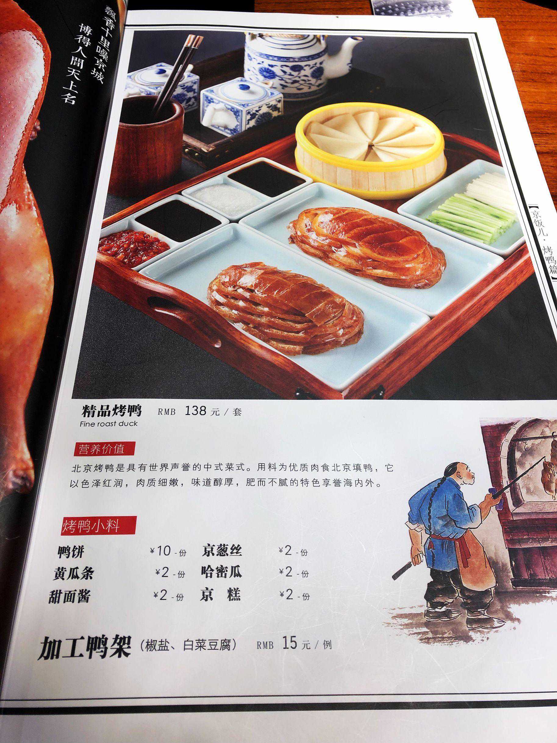 看看菜单吧,烤鸭138,比我周末探店的北京马连道茶叶城附近新开的便宜坊烤鸭店便宜不少。探访北京马连道茶叶城附近新开的便宜坊烤鸭店,南城朋友的福音,南城喜欢吃便宜坊鸭子的朋友可以点开链接看看餐厅环境等具体信息。我除了在专门吃鸭子的店像便宜坊,全聚德,四季民福,大董这些地方点烤鸭之外,很少吃京菜馆的鸭子,没亲自尝试没有发言权,只能从价格上做下对比,相对来说,老浒记的普通烤鸭更便宜,108一只。峨嵋酒家的鸭子168。