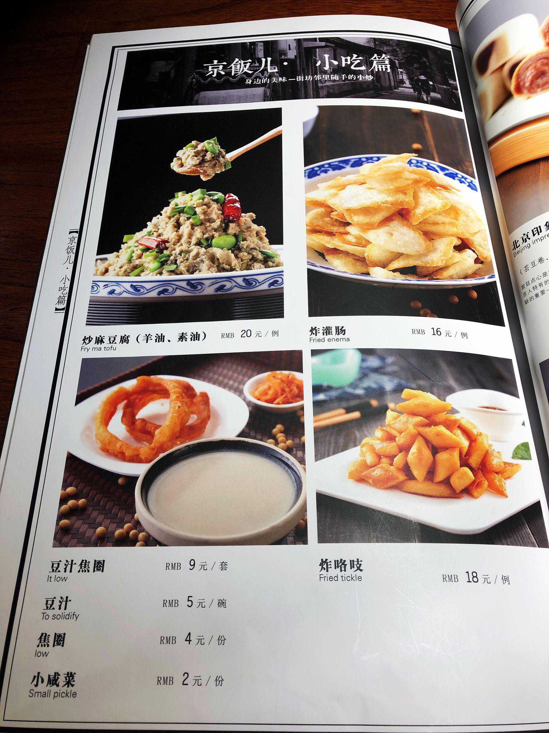 京菜馆少不了炒麻豆腐,炸灌肠,豆汁焦圈,这家还有炸咯吱。自打上次在老浒记吃羊油炒的麻豆腐膻着我之后,我就对麻豆腐失去了兴趣。觉得天坛北门大碗居的菜不好吃的,来琉璃厂老浒记京味餐厅尝尝。