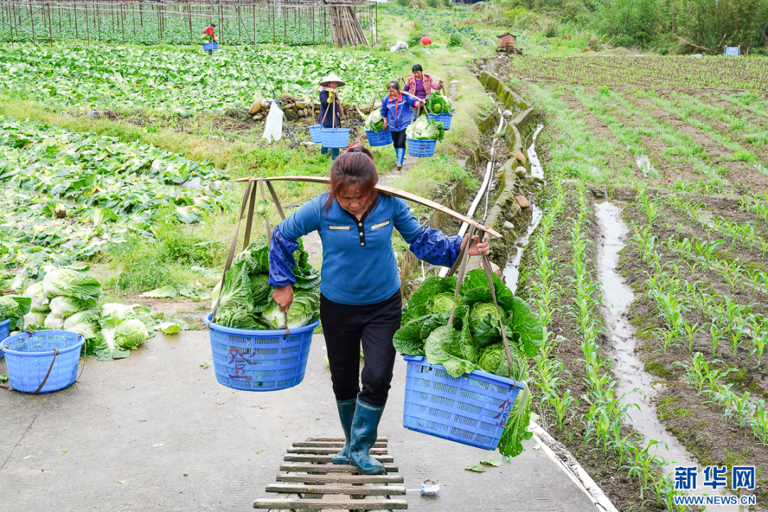 4月8日,农户将大白菜挑出田间,准备装车。新华网肖和勇摄